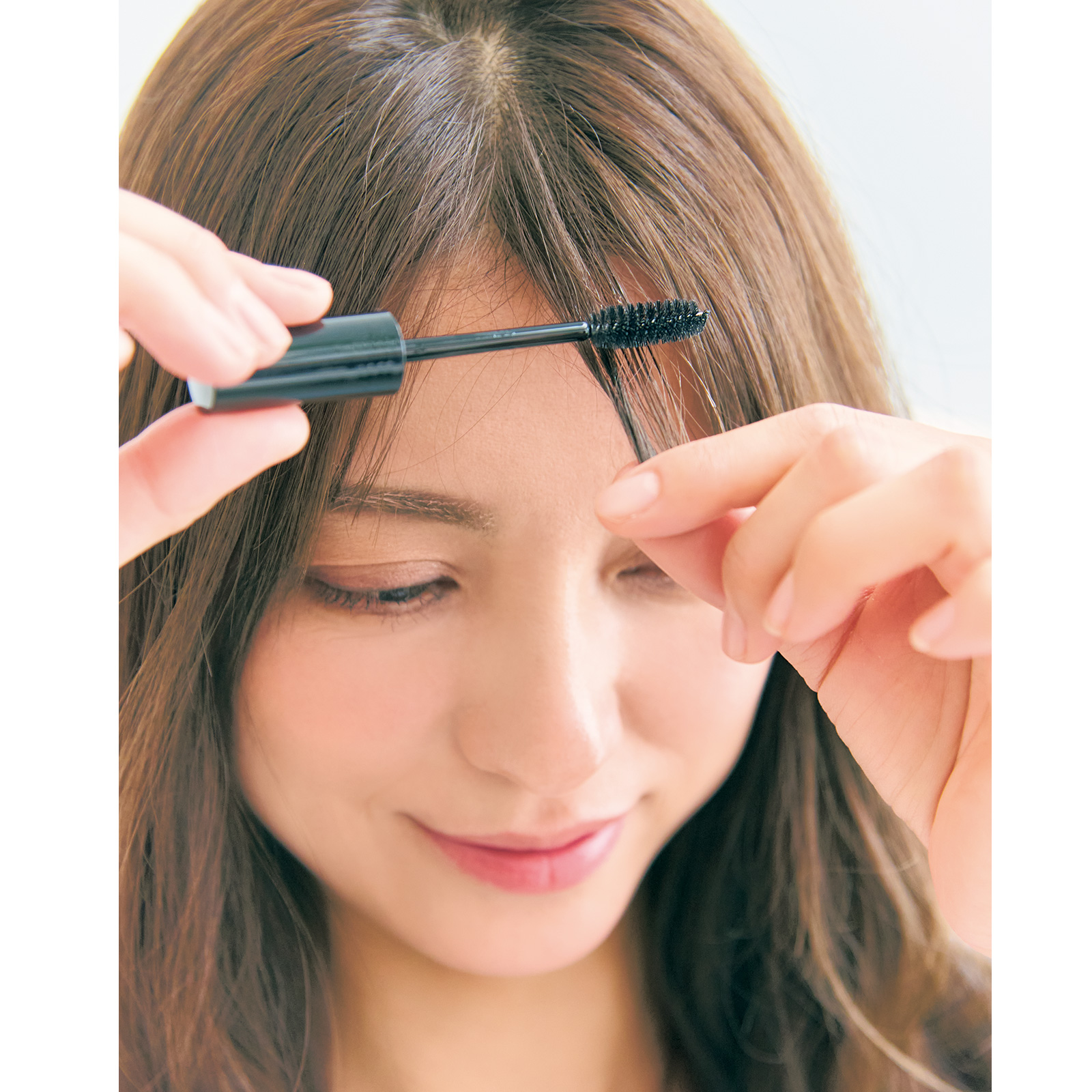 2.前髪用でマスカラタイプのセット剤を使います。前髪を引き出して、根元から毛先までブラシでスッとスライドするようになじませて。