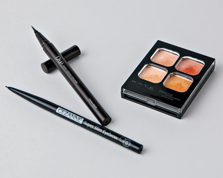 左:自然な毛流れの眉に仕上がる、セザンヌの超細芯アイブロウライナー03。リアルな毛が描けるので、眉メークが苦手な母もこれを使うようになって、眉がキレイに整うように。中:D-UPのシルキーリキッドアイライナー ブラウンブラックは、丁度いい太さで描きやすいと母も大絶賛!優しい印象の目元にしてくれます。右:立体的な目元が作れるKATEのポッピングシルエットシャドウEX-1。母に教えたところ、キレイに発色するしラメも自然で良いねと喜んで使っています。