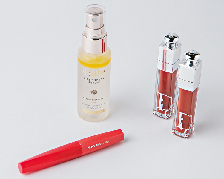 上:ダルバ ホワイトトリュフ ファーストスプレーセラムは、乾燥対策として母にすすめたら数本リピートしています。下:ふんわりした美眉が続くデジャヴュのアイブロウカラー ナチュラルブラウンは、立体眉がテクいらずで仕上がると、母も必需品に。右:グランドスタッフとして働いているのですが、同業者の愛用が多いのがDIORアディクト リップ マキシマイザー039(手前)、018(奥)。上品に色づいたふっくらリップになるので、母も会社に行く日に使うようになりました。