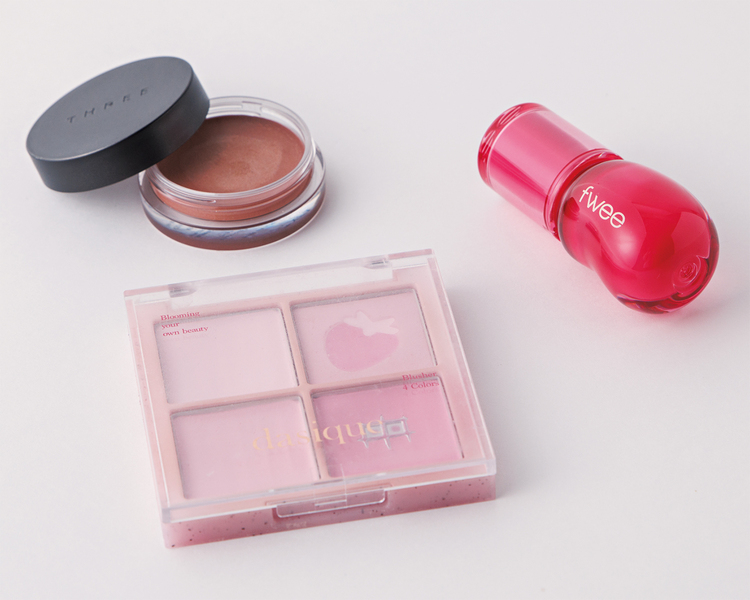 上:目元、眉、リップにも使えるTHREE グラムトーンカラーカスタード04。忙しい4児の母にピッタリなマルチに使える便利コスメ。ウォームベージュの色味が気に入ったよう♡下:ふんわり可愛いピンクの頰になりたいとリクエストされ、教えてあげたデイジーク ブレンディングムードチーク#06。右:バズった韓コスfweeの3D Voluming Gloss A03 Candy30%。ぷるちゅる唇になれると母にすすめたら、可愛いと大絶賛!他の色も欲しいとおねだりされました(笑)。