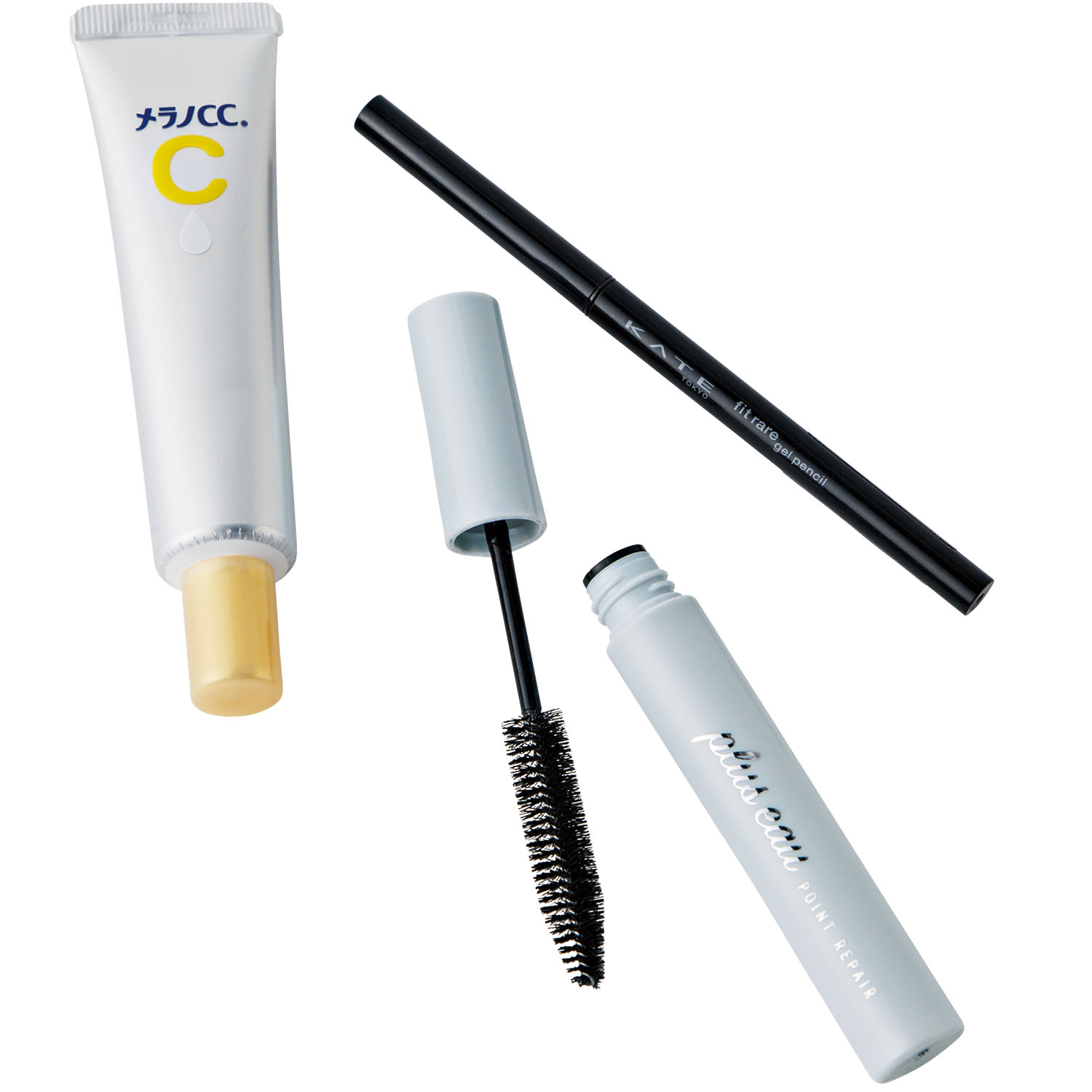 左:少し前に初めて発見してショックだったシミには、メラノ CCの薬用しみ対策保湿クリームで地道にケア。薄くなってきたので、同じくシミに悩む母にすすめて、親子で愛用。中:母も私も撮影されることが多いので、写真で意外に目立つアホ毛対策に、プリュスオーのヘアマスカラをヘビロテ。右:目元のシワが気になってきた母が「繊細なアイラインが引きにくい」と悩んでいたので、芯が軟らかいKATEのアイライナーをおすすめしたら、目の際も描きやすいと喜んでくれました。