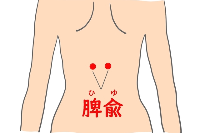 脾兪は、背中の腰椎あたりにあるツボです。正確には「気をつけ」の姿勢で両手を垂らし、両肘の先端を直線で結んだ第十二胸椎の位置から、外側に指2本分離れた場所にあります。