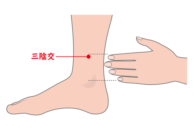 足のくるぶしの内側の出っ張りから、指4本分上の位置にあるツボです。冷えからくる胃腸の不調や、婦人科系のトラブルにおすすめです。