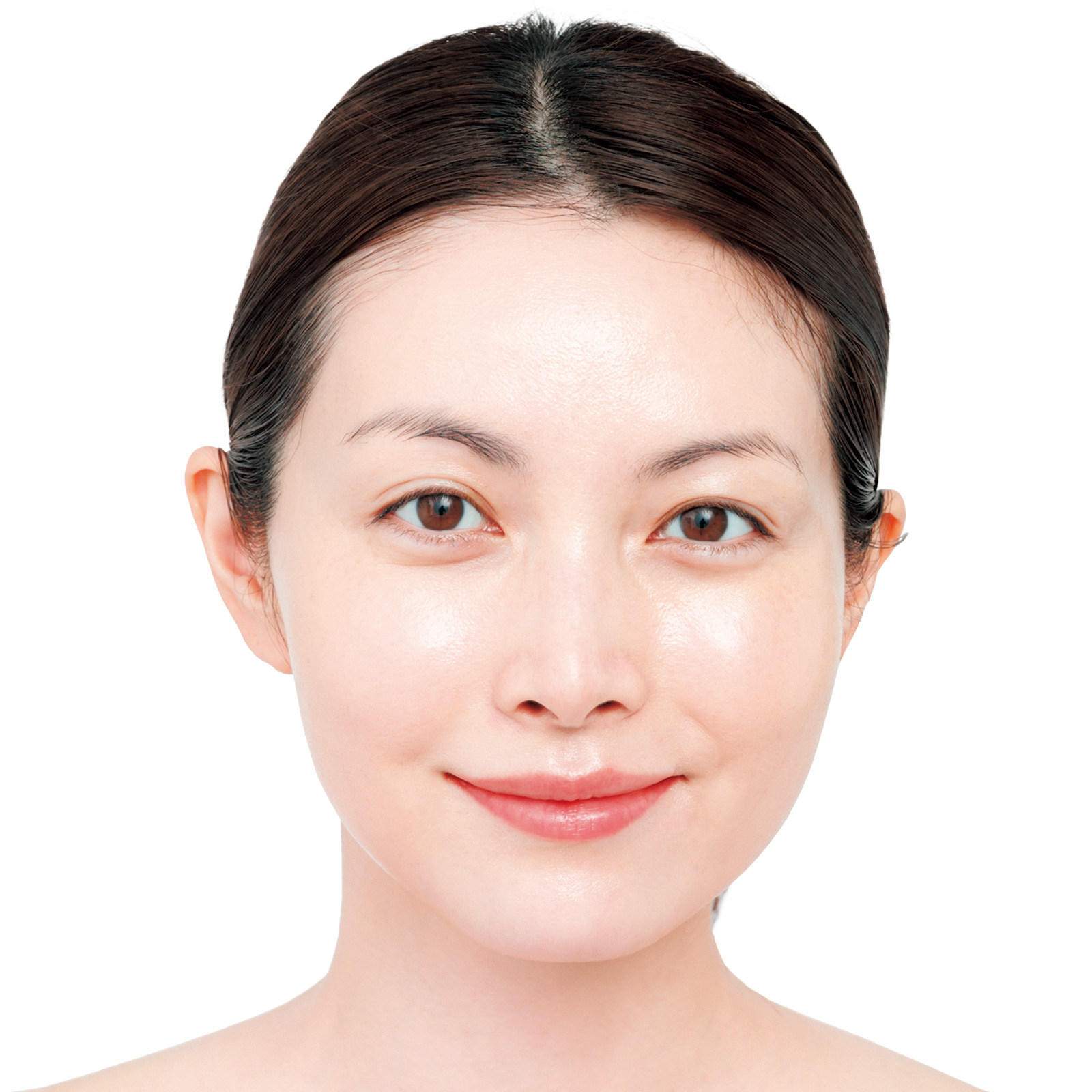 鼻をスッキリ見せるためには、他のパーツとの境界線をはっきりさせることが肝心。特に頰との高低差をつけると、鼻のフォルムがシャープに際立ちます。そのために使うのはチークとハイライト。ほうれい線の入口、つまり小鼻の周りに細かくのせて影を消し、フラットに整えましょう。さらに眉間から鼻根、鼻先、鼻横や頰骨の上、額の際に細かくチークとハイライトを仕込むほど、顔の印象が立体的になり、鼻まわりの骨格もシュッとスマートに整います。
