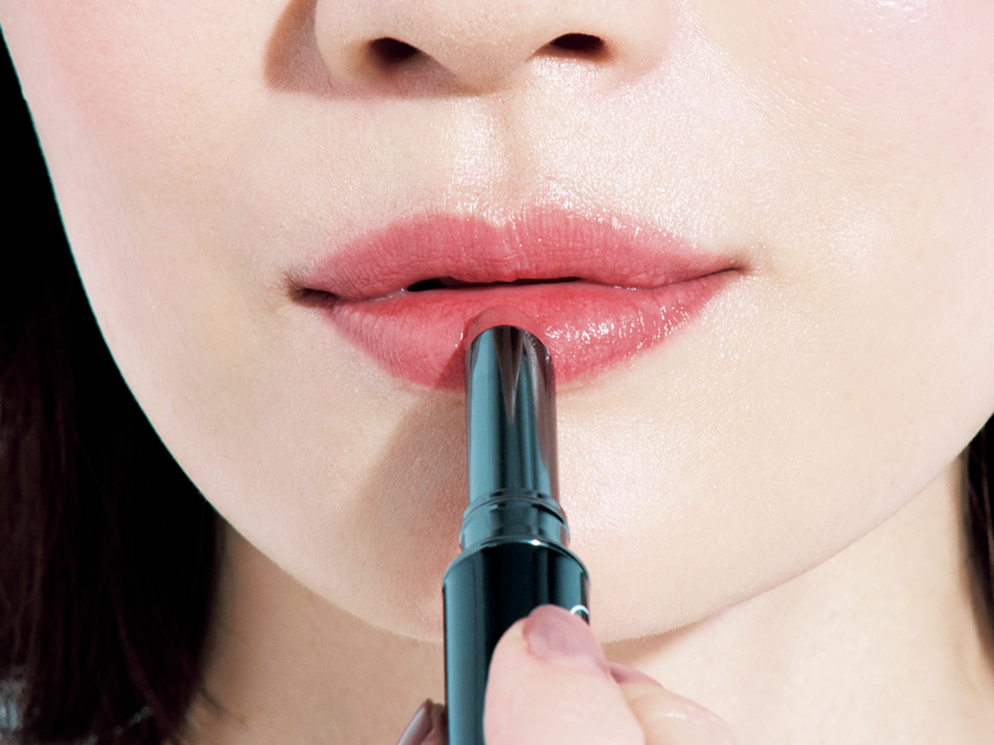ややオーバーになるようにリップを直塗りし、唇の中央のみに重ね塗りします。唇の立体感が強調されて、ボリュームリップが完成。