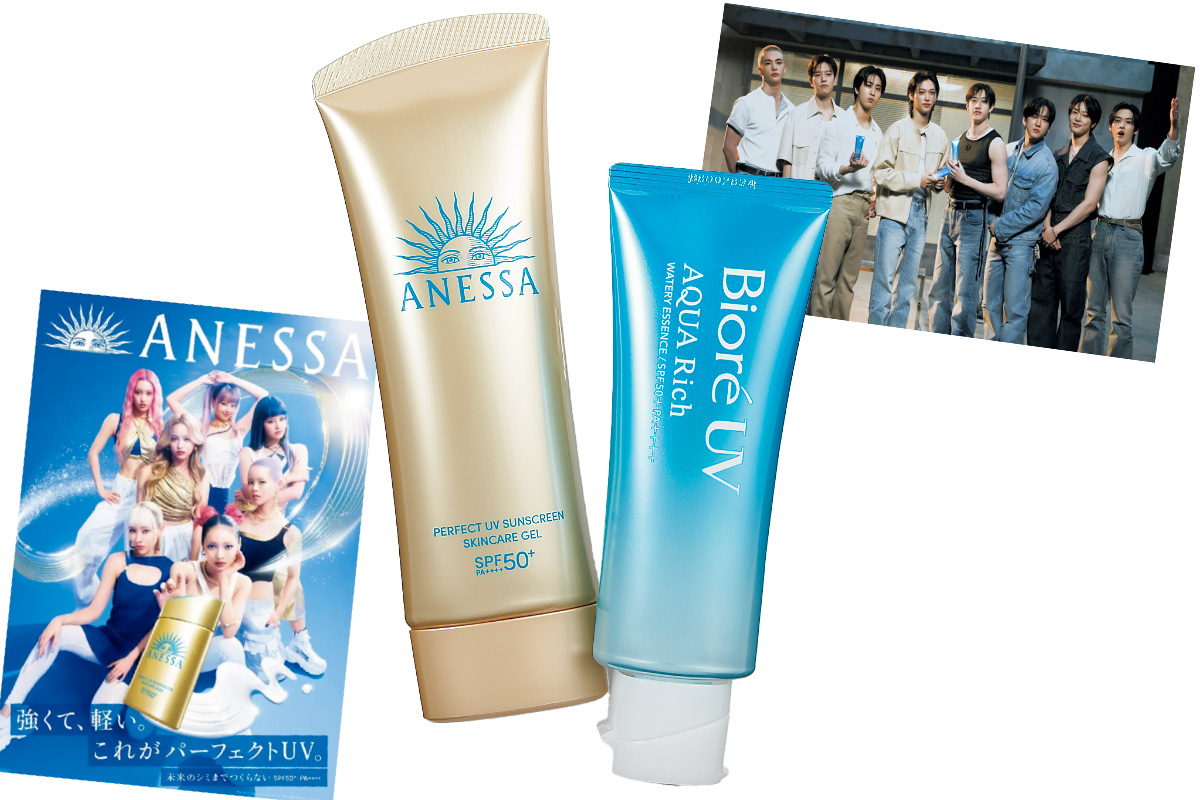 左:アネッサ新ミューズはXG!ヨレや隙間を自動修復。アネッサ パーフェクトUV スキンケアジェル NA SPF50+・PA++++ UV耐水性★★ 90g ¥2,508〈編集部調べ〉(資生堂)右:ビオレはグローバルキャンペーンにストレイキッズを起用。瞬時に馴染みムラのないUV塗膜を形成。ビオレUV アクアリッチ ウォータリーエッセンス SPF50+・PA++++ UV耐水性★★ 70g ¥968〈編集部調べ〉(花王)