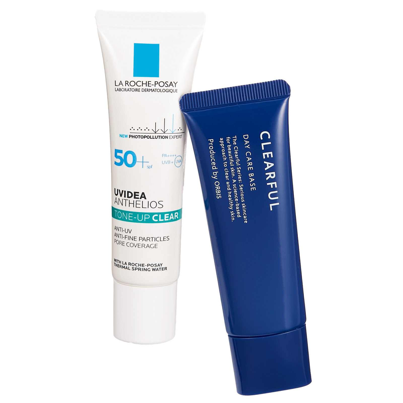 左:定番・ラ ロッシュ ポゼにクリア&テカらずトーンアップできるタイプを発見。独自フィルターで膜を張り高UV効果を実現。UVイデア XL プロテクショントーンアップ クリア SPF50+・PA++++ 30ml ¥3,960(ラ ロッシュ ポゼ)右:オルビスのニキビケアシリーズで発見! 自然なトーンアップが叶うベース。クリアフル デイケアベース SPF28・PA+++[医薬部外品] 30g ¥1,320(オルビス)