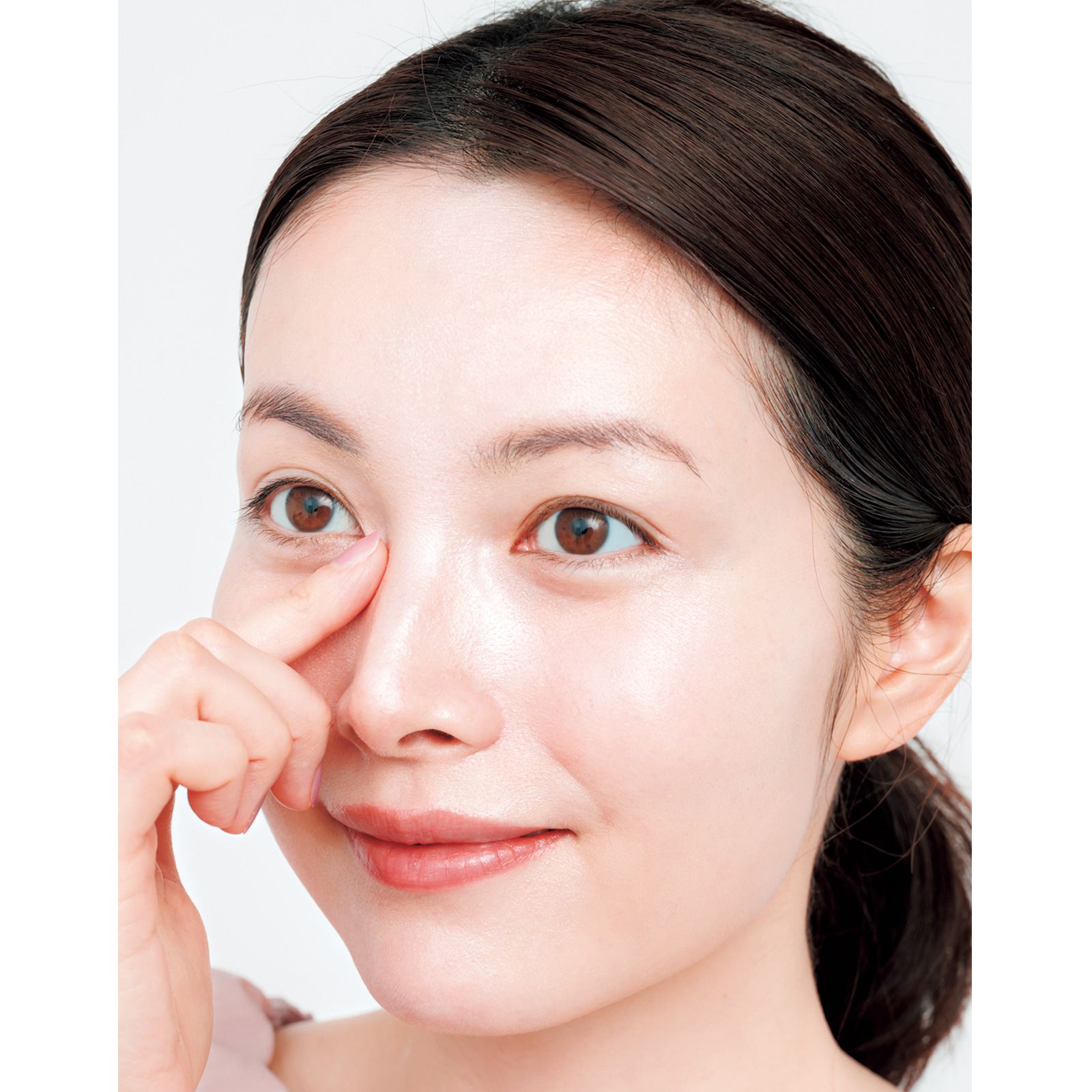 ハイライトも指で狙い撃てば簡単。眉間から鼻根の小さいT字部分、鼻横、鼻先、額の中央上部にもオン。さらに頰骨の高い部分を上から下に切るようにのせると、頰だけでなく鼻まで小さく見える効果が。微細なパール入りのパウダータイプを選ぶと、ほのかな光で効果倍増。色は白よりイエローやピンク、ブルーからなりたい雰囲気で選んで。美ST世代には色ムラも馴染む黄み系がおすすめ。