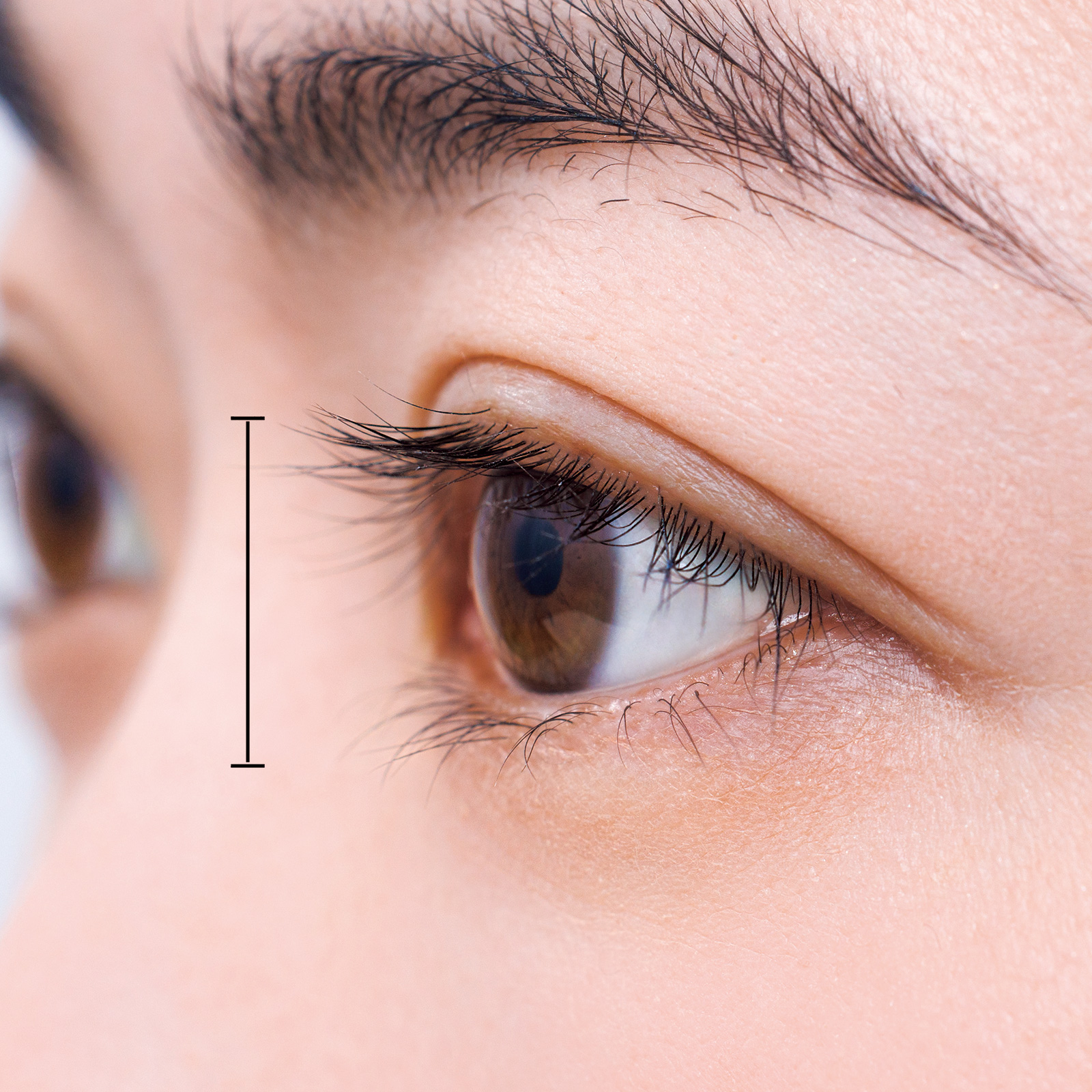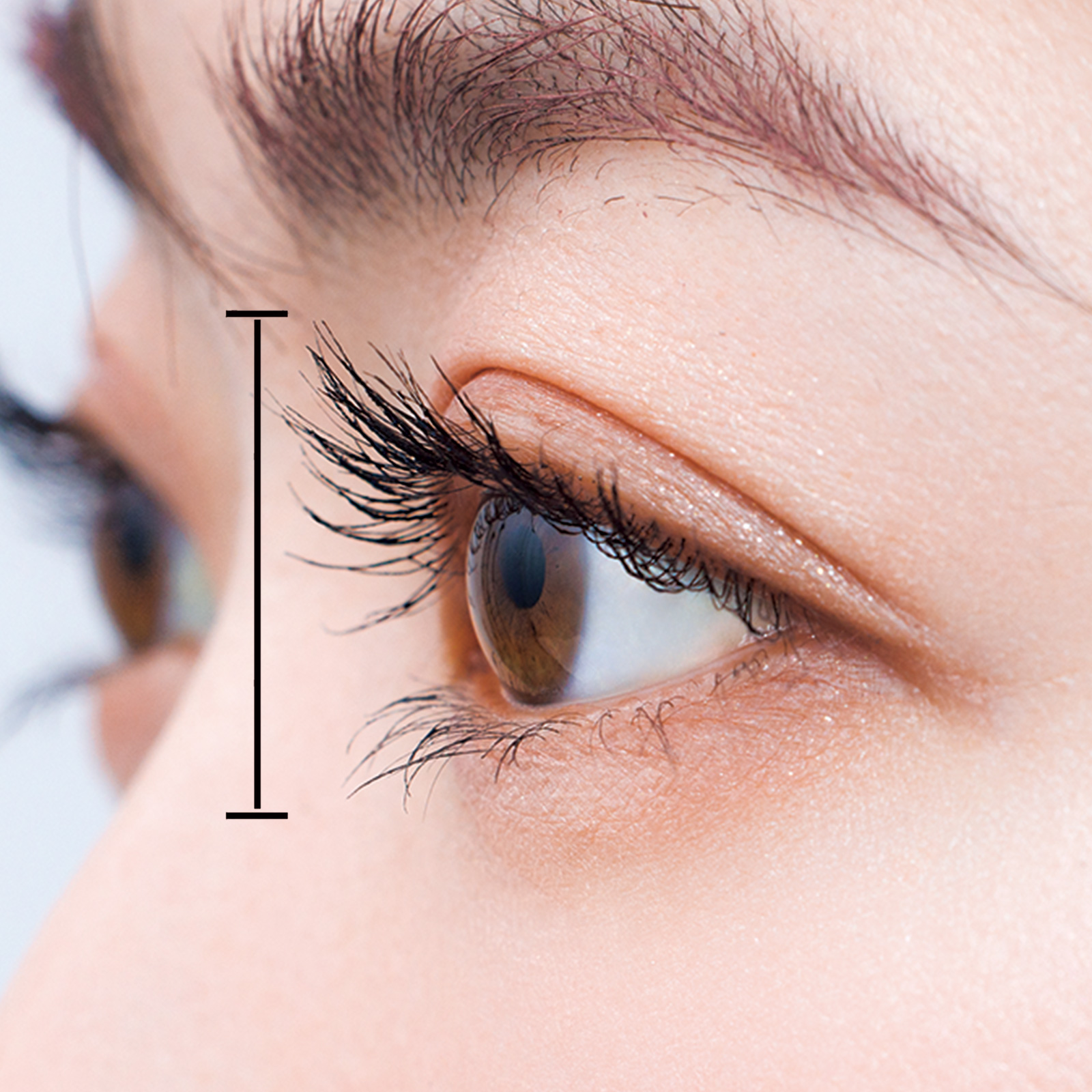 目の大きさを人は、上まつ毛の一番上と下まつ毛の一番下までの幅でまるっと認識します。つまり目の大きさは、まつ毛の太さではなく上下の幅を出すことが大切。パチッとした目が印象づけられます。