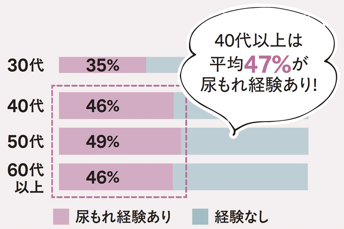 産後に経験するイメージのある尿もれですが、実は更年期世代以降では、約2人に1人が尿もれを経験しています。