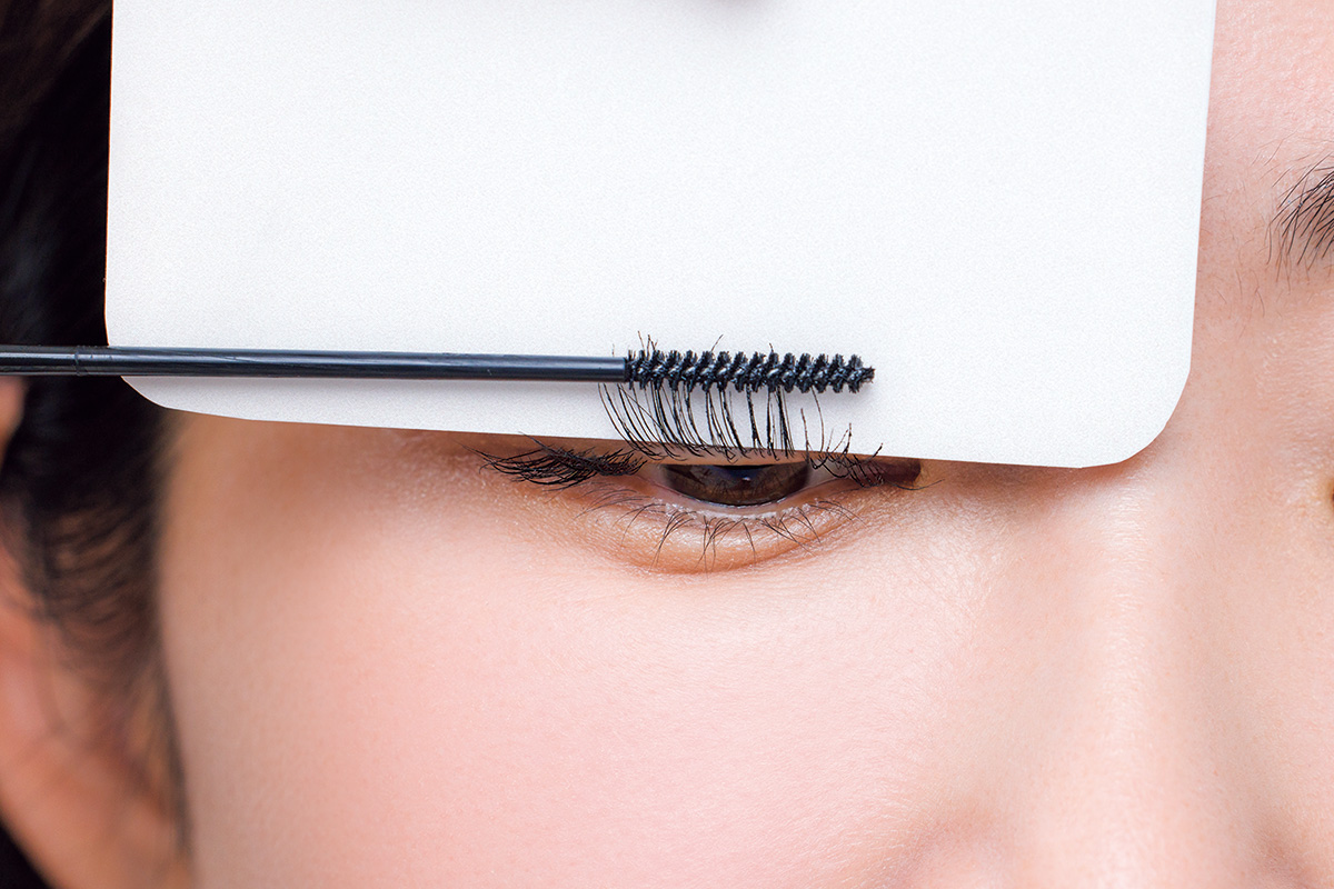 根元は押さえつけ毛先に向かってスーッと上に。厚紙を挟むことでまぶたについてしまう心配がなく、圧をかけながら塗布できます。液がよりまつ毛にしっかりつき存在感が出ます。