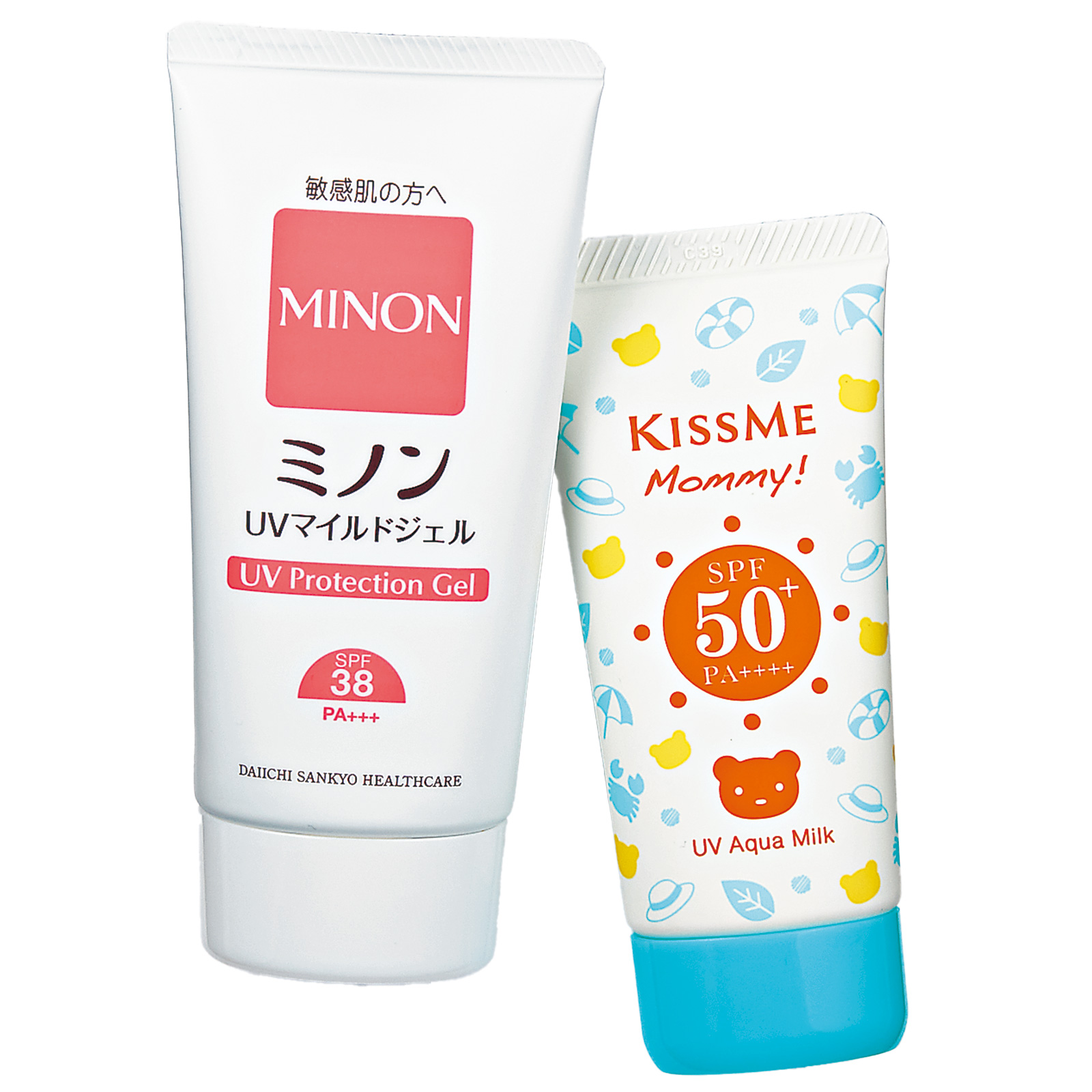 左:肌を守りながら潤いを与える処方でバリア機能をキープ。毎日の登園登校など日常使いに◎。ミノンUVマイルドジェル SPF38・PA+++ 70g ¥1,870〈編集部調べ〉(第一三共ヘルスケア)右:80%食品成分、無添加処方で安心。最高UVカット指数で外遊びに最適。ウォータープルーフなのに石けんで簡単オフ。マミー UVアクアミルク SPF50+・PA++++ 50g ¥990(KISSME〈伊勢半〉)