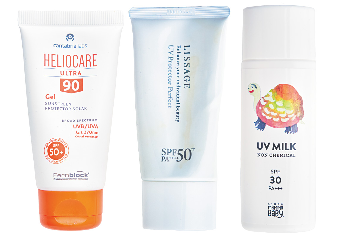 「ヘリオケアのUVクリームは皮膚科で購入して以来15年以上愛用。毛穴が詰まらずお気に入り。こすれや摩擦に強いリサージのUVプロテクターはボディ用に。娘には完全ノンケミカル・ノンシリコンのママベビーのUVミルクを。小さい子供はお風呂もまだサポートが必要なので、石けんだけで落とせるのもいいですね」