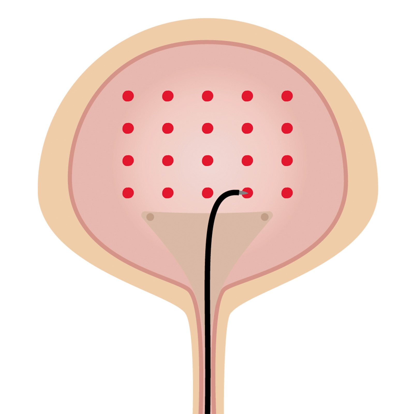 過活動膀胱による尿失禁は、膀胱の筋肉が異常な収縮を起こすことで発生します。一定期間内服治療などをしても効果がない場合、膀胱壁にボトックスを20カ所注射し過剰な収縮を緩和します。保険適応の治療です。