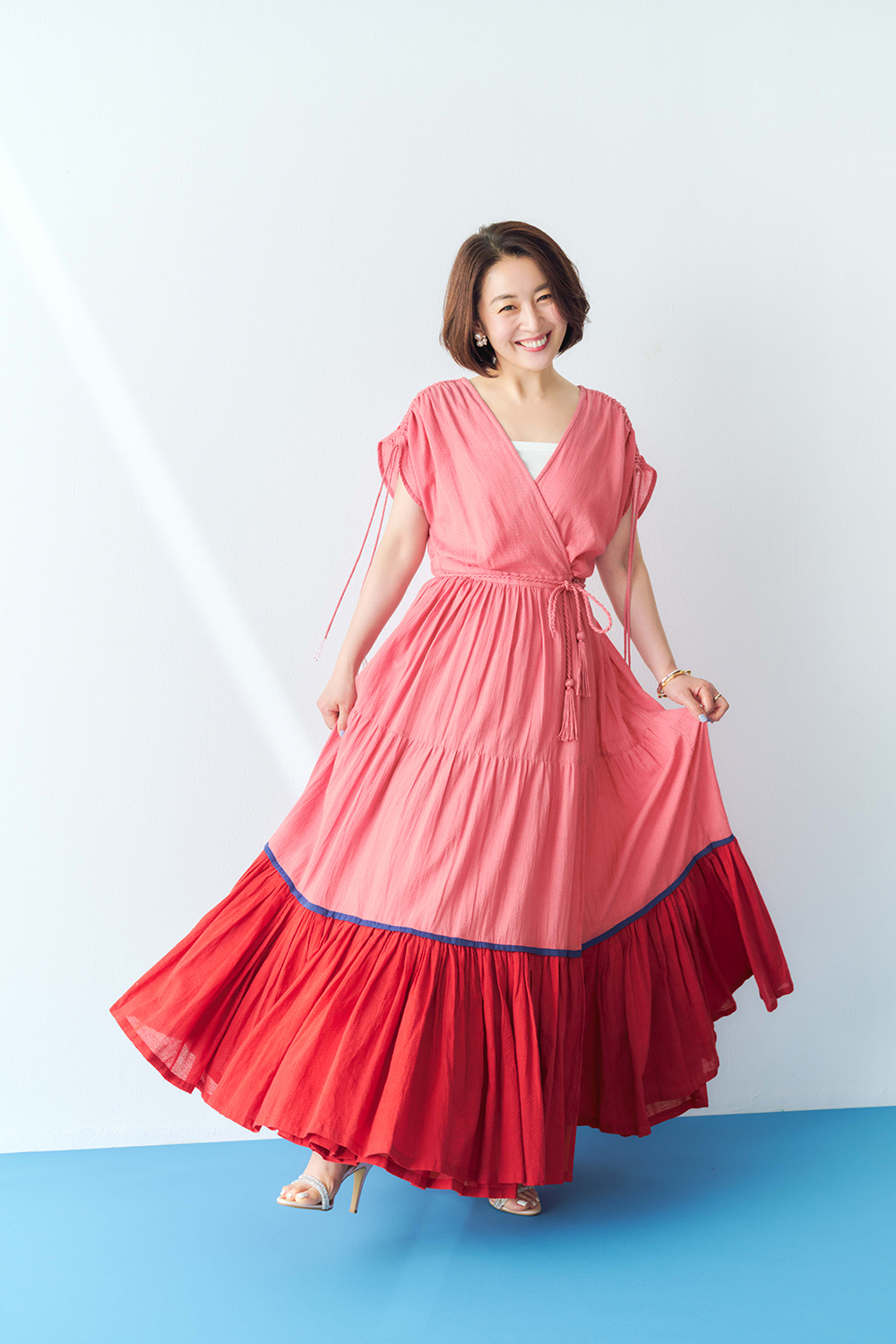 ワンピース¥48,400(ヴェルニカ/ヴェルニカ ルーム)サンダル¥17,600(ダイアナ/ダイアナ銀座本店)イヤリング¥9,900ゴールドバングル¥5,670シルバーバングル¥17,600左手リング各¥15,750右手リング¥8,910(すべてアビステ)
