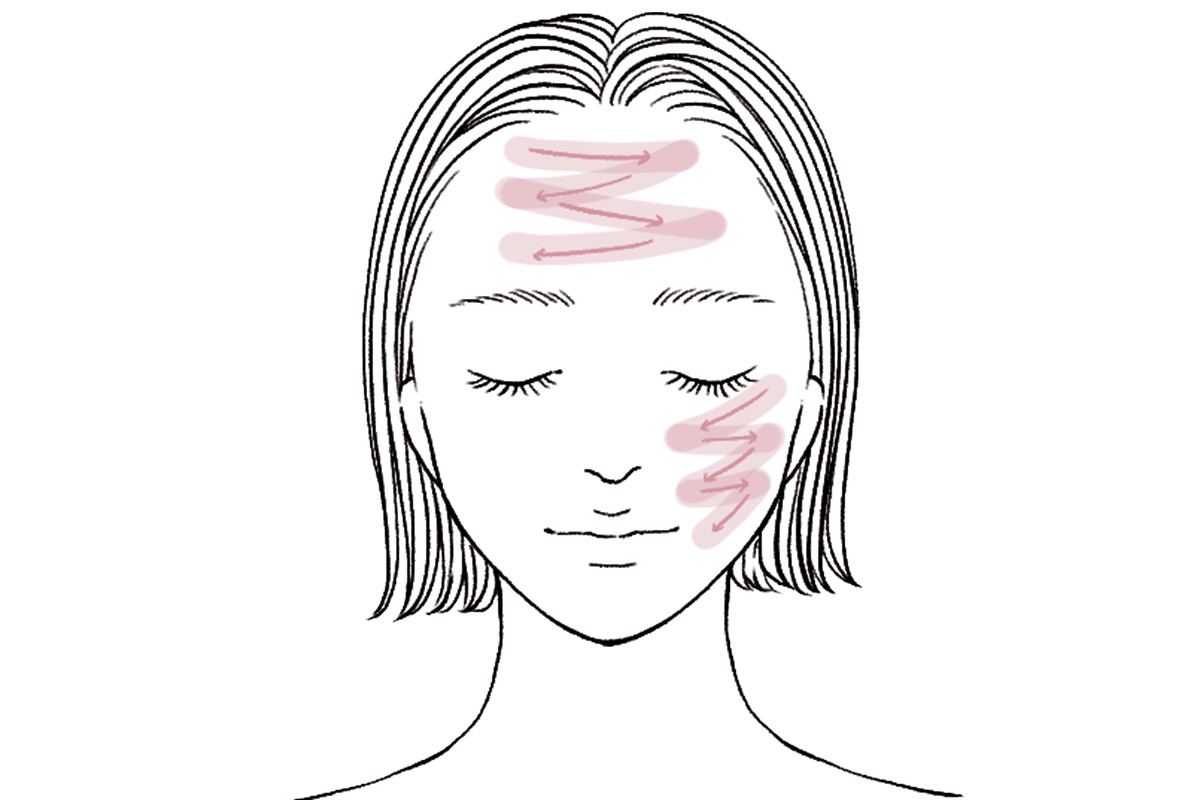 塗ると透明なものが多く、塗布した境目がわかりにくいので、額や頰などの広い範囲は塗ったところが重なるようにジグザグに。うっかり隙間焼けを防げます。