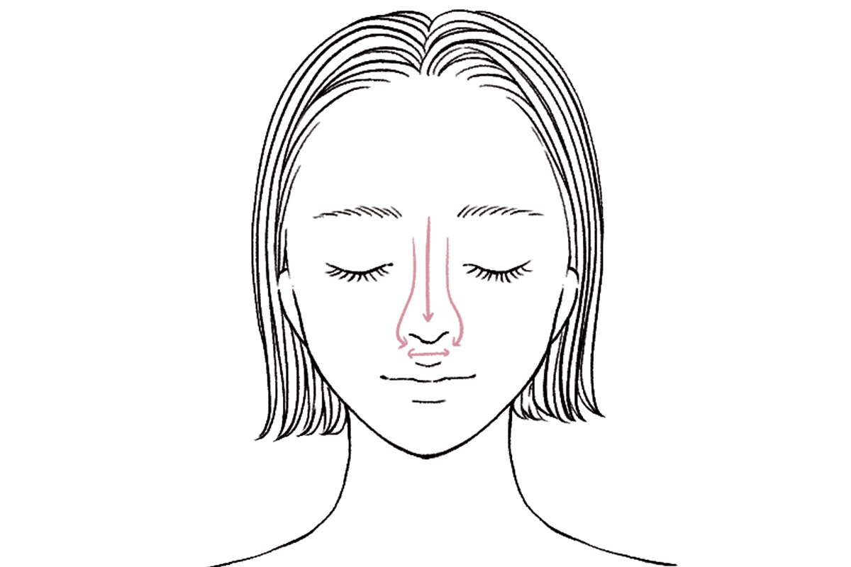 目のキワや小鼻など凸凹があり細かいパーツは、スティックの広い部分ではなく角の部分を使用。縦向きに持ち、隙間ができないように小刻みに塗り重ねます。
