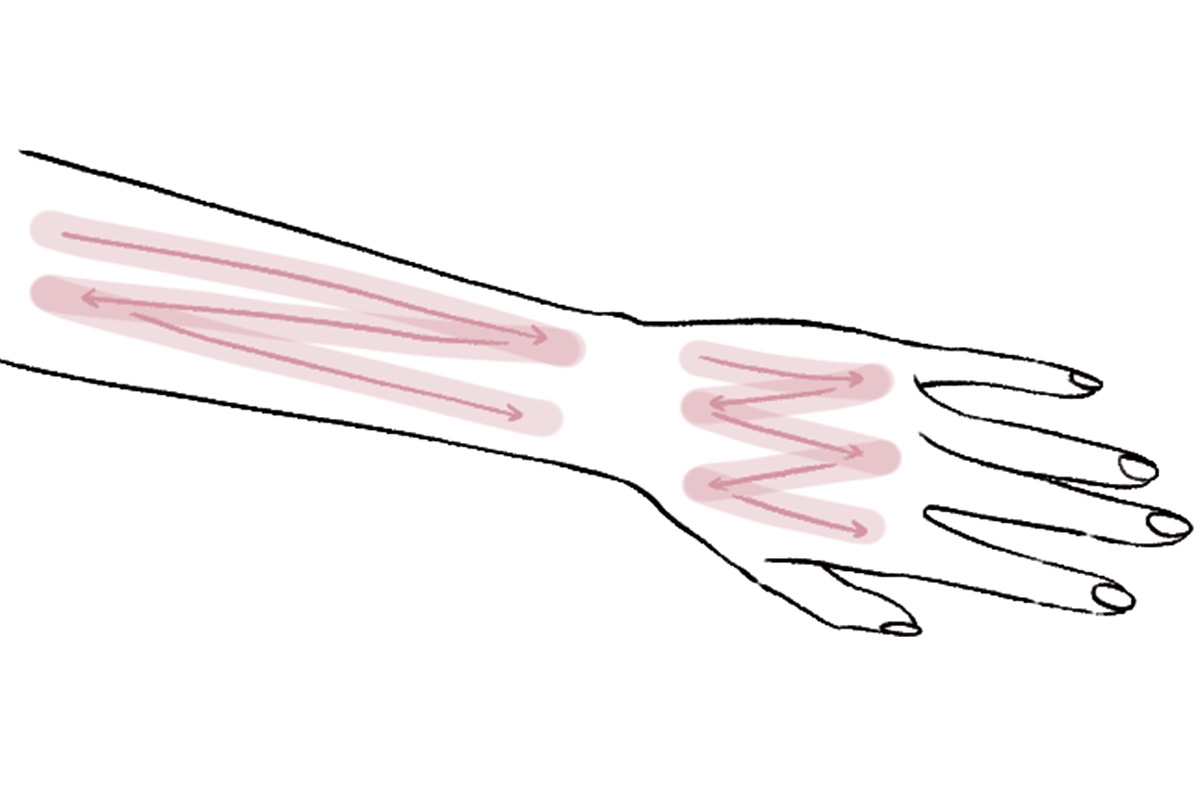 腕や手の甲も、顔と同じように塗ったところが重なるようにジグザグ塗りを。意外と見落としがちな指と指の間は、スティックを縦にして塗るとムラを防げます。