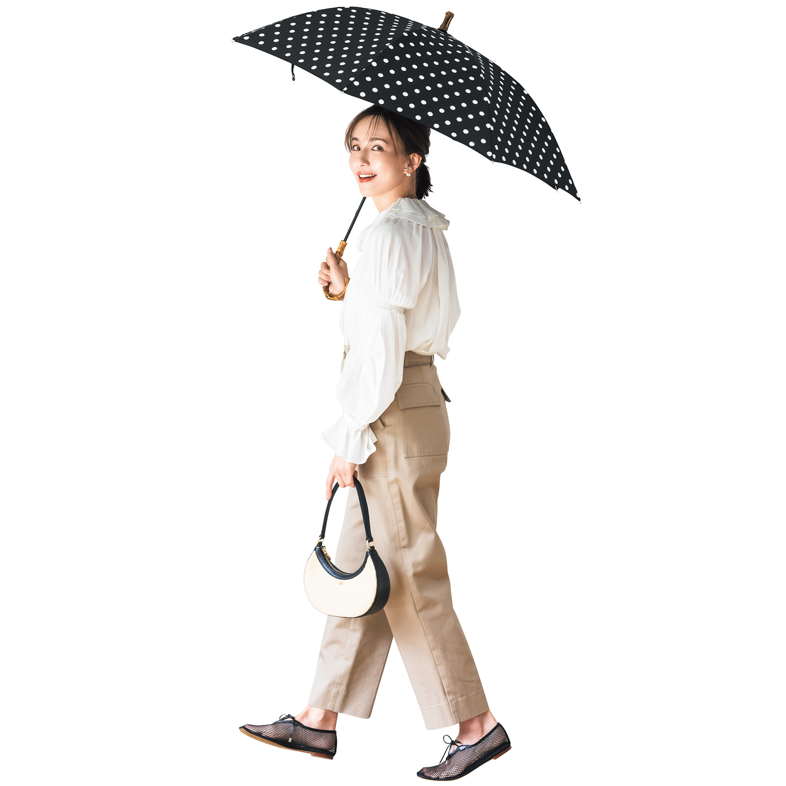 バンブーハンドルや黒の傘骨が、クラシカルなドット柄を大人っぽく格上げ。ミュートカラーで大人っぽい夏コーデのほどよいアクセントに。