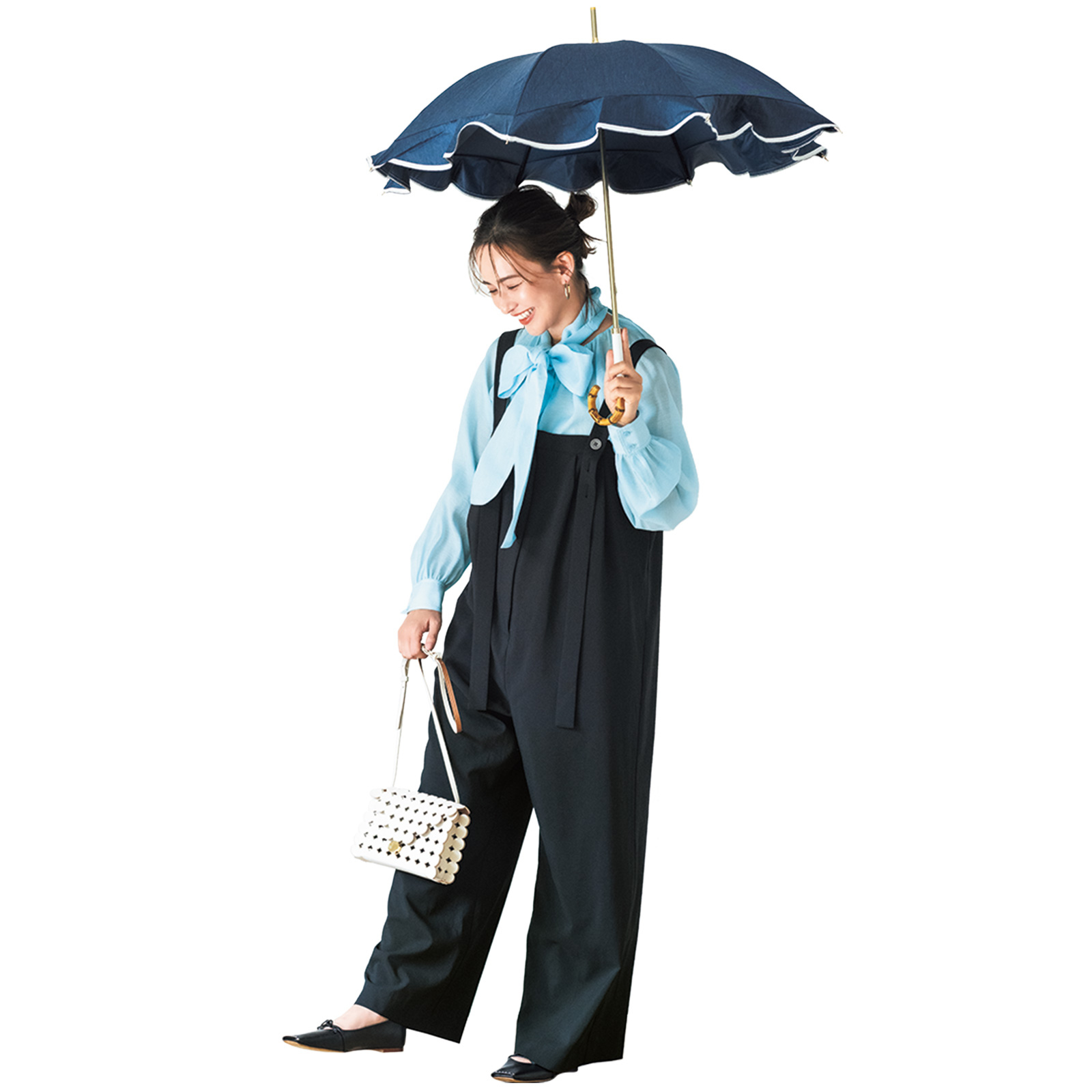 サロペット¥31,900(エリオポール/エリオポール代官山)ボウタイブラウス¥19,800(ルーニィ)バッグ¥33,000(メアリ オル ターナ/AL Design Inc.)パンプス¥38,500(チェンバー/クルーズ ショールーム)ピアス¥3,960(ヘンカ/ロードス)日傘[遮光率99%以上、UVカット99%以上]¥16,500(Gracy/ムーンバット)