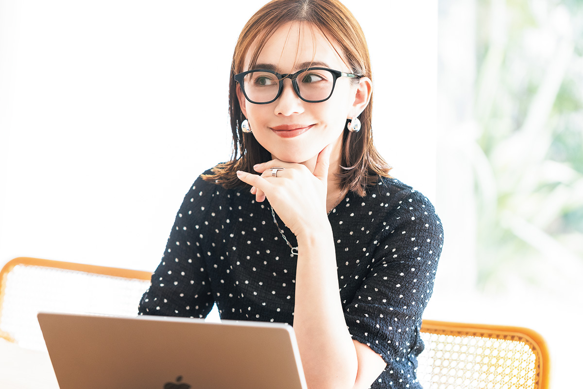 《衣装クレジット》眼鏡¥7,700(Zoff/ゾフ カスタマーサポート)ドット柄ブラウス¥14,300(ルーニィ)バッグ¥11,900(CHARLES & KEITH/CHARLES & KEITH JAPAN)リング[左手]¥3,080ピアス¥3,960〈ともにヘンカ〉ネックレス¥3,850〈デイジールイス〉リング[右手]¥21,120〈CHIRO JEWELRY〉(すべてロードス)