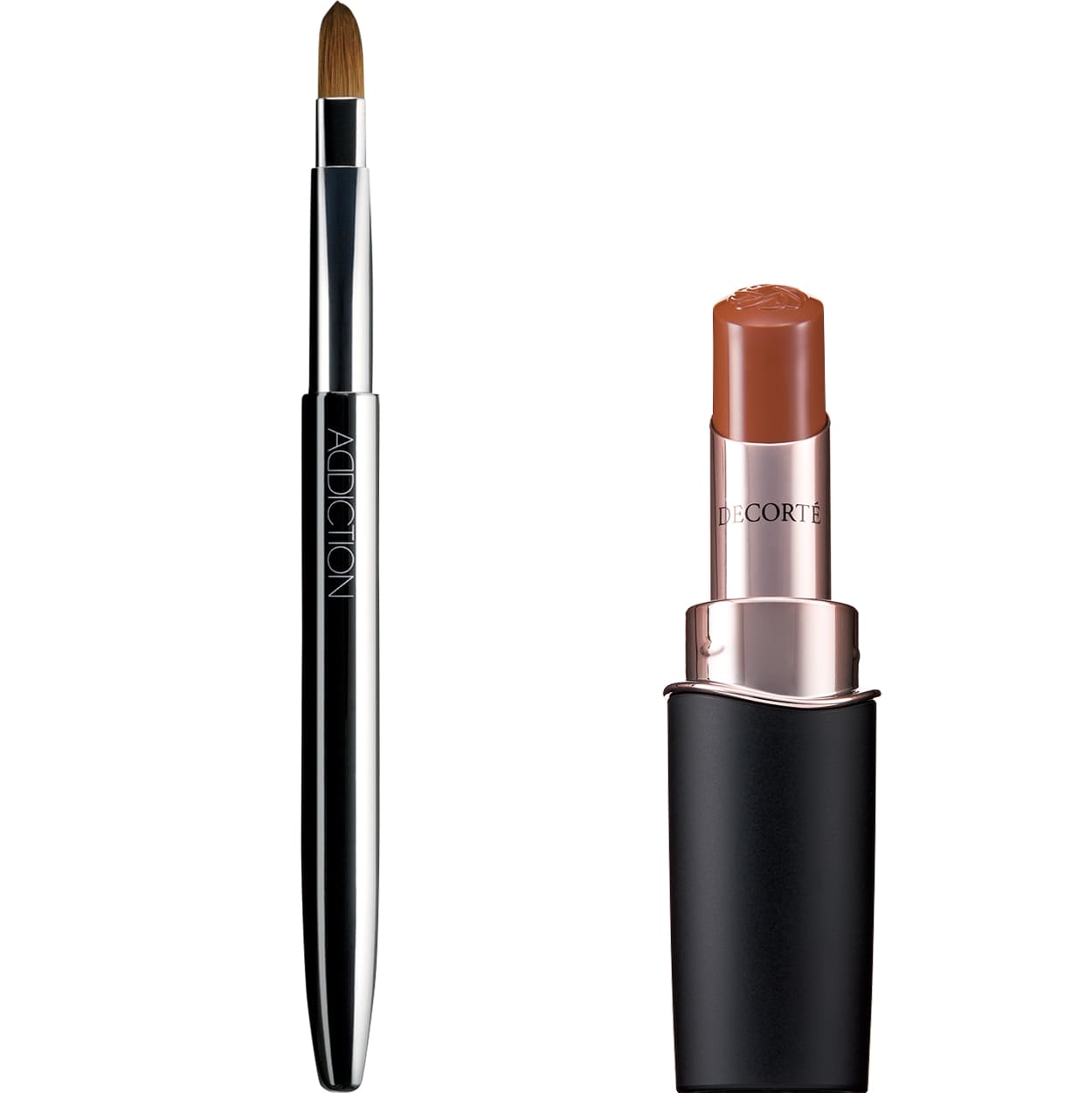 ①上唇の山からシアーな発色のリップを重ねていきます。②下唇も同様に、1で描いた輪郭の内側に馴染ませます。③口角は特に丁寧に。マットタイプと柔らかくシアーな発色のリップと、質感違いの2本で仕上げると、落ちにくくなり、肌とのコントラストもできるのでかっこいい仕上がりが叶います。左から:アディクション リップ ブラシ リトラクタブル ¥3, 300(ADDICTION BEAUTY)DECORTÉ ルージュデコルテ クリームグロウ 23G rosewood ¥5,500(コスメデコルテ)