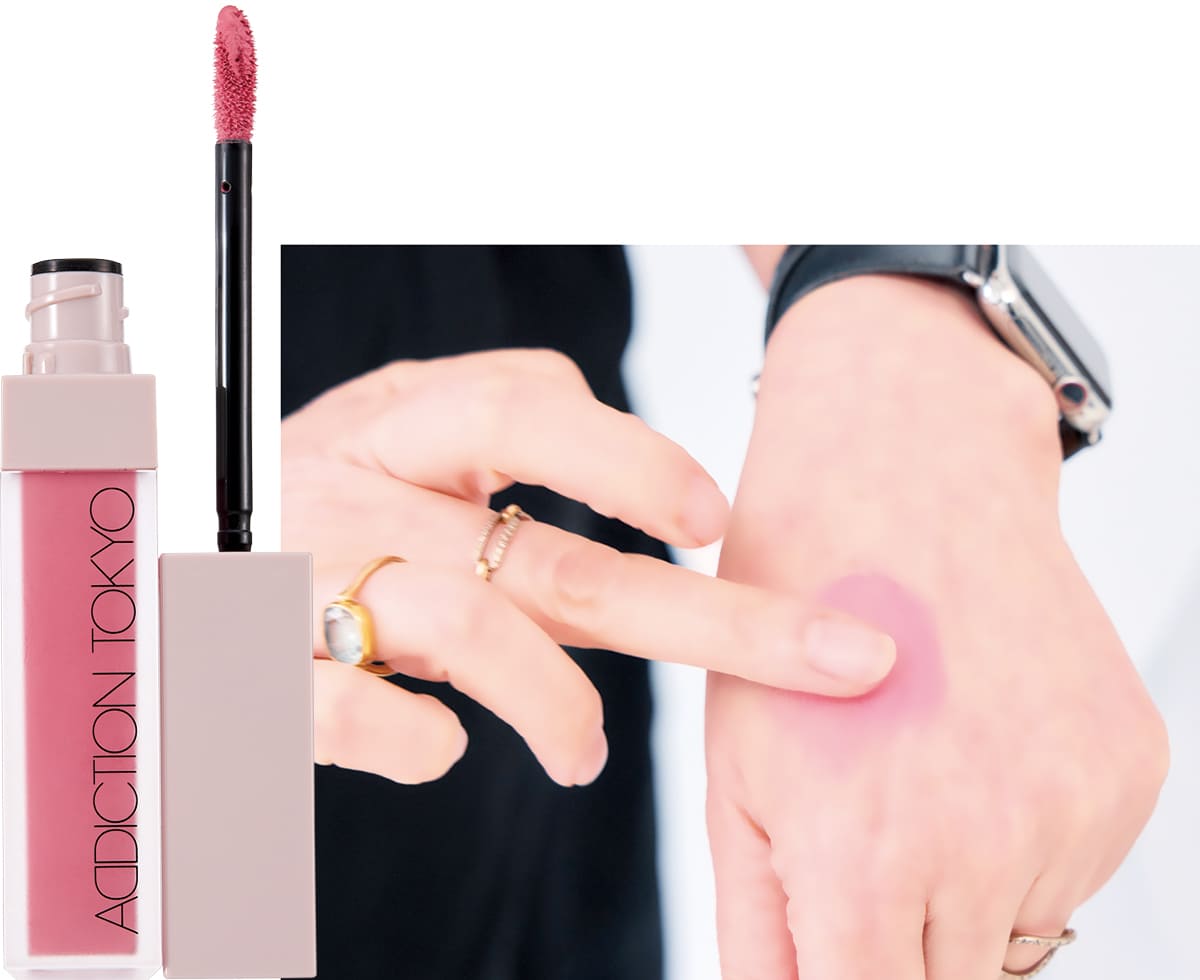 明るいピンクのチークがリップの重さを軽やかにしてくれます。チークを手の甲に取ってから、黒目の下の頰の高い位置から指でスタンプするように広範囲にぼかしていきます。強さを抑え透明感と可愛らしさをプラスします。アディクション ザ リキッドブラッシュ フォギー 002 So Cushy ¥3,740(ADDICTION BEAUTY)