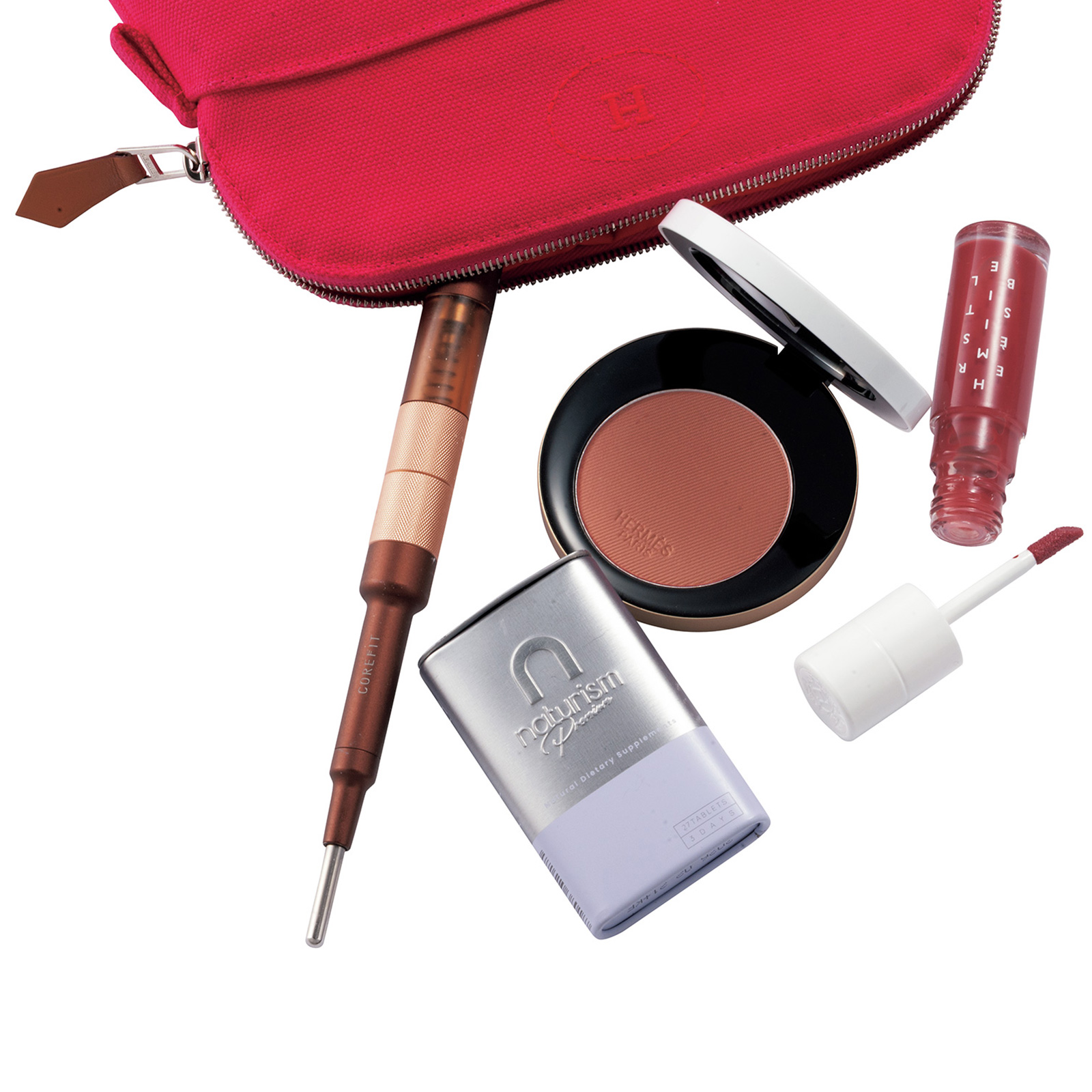 ツヤが即出るエルメスのチーク35とリップオイル05。移動中にツボ推しして老廃物の排出を促すCOREFITのフェイスポインター。ナチュリズムのダイエットサプリは食前に。