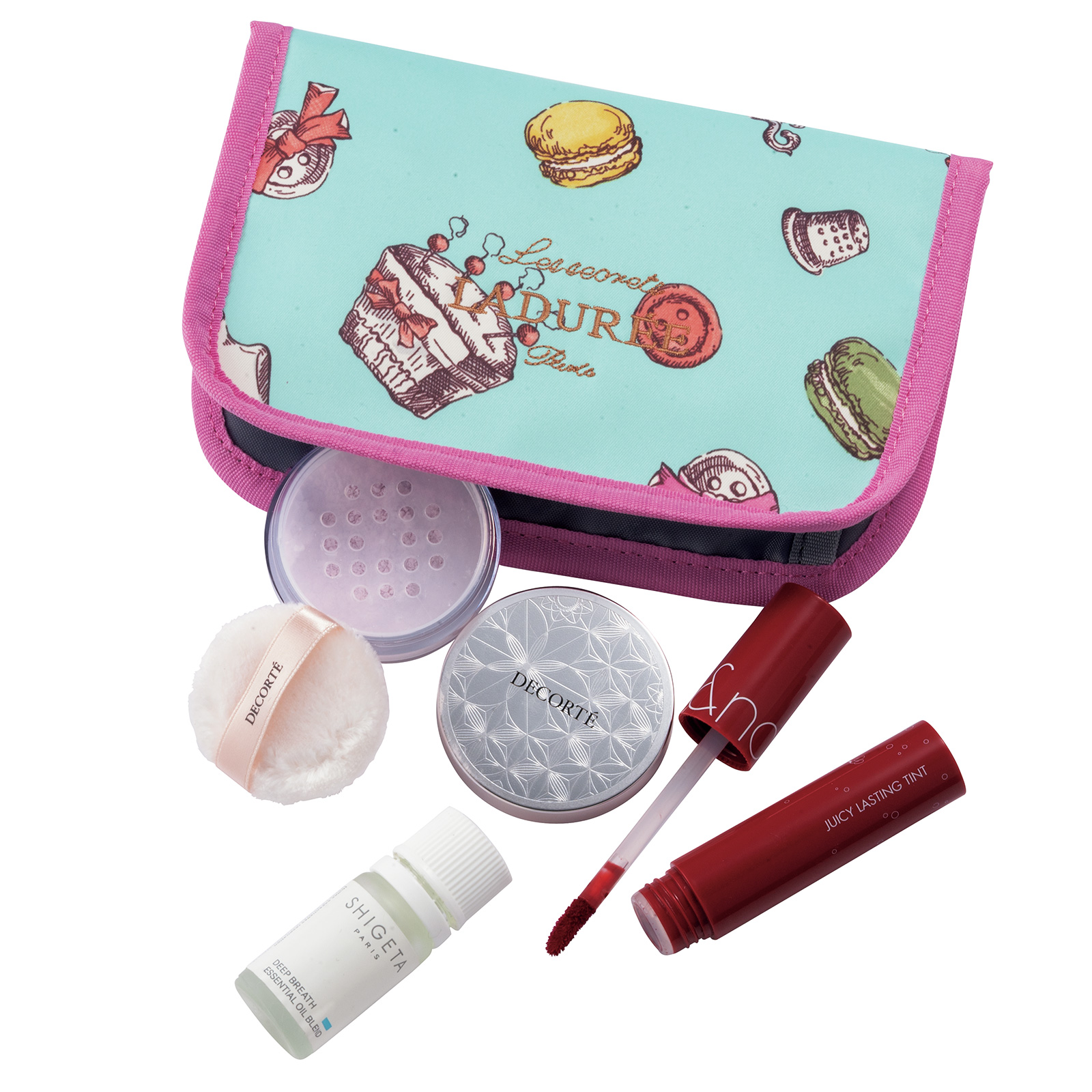 メイクよれ防止のコスデコのパウダーは必需品。SHIGETAのディープブレスは呼吸を整えてくれるお守りアイテム。ロムアンドのリップ16番はツヤ感がお気に入り。