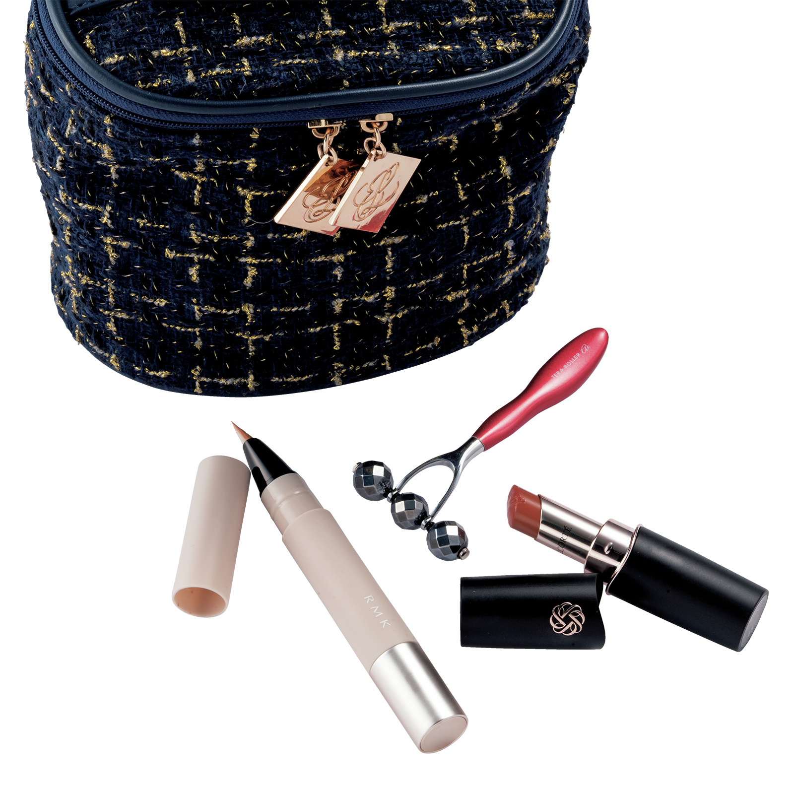 RMKのコンシーラーはさっとお直しできてお気に入り。コスデコのリップ09は鏡を見なくても塗りやすい! テラローラーで、出先でも顔のむくみをスッキリ。