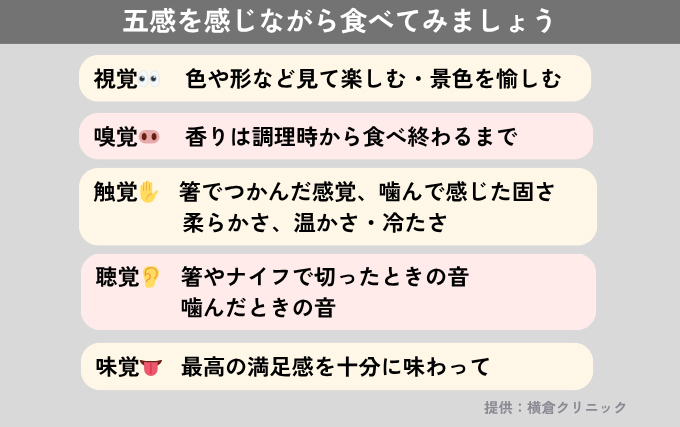 もうひとつは、食事を “五感で味わいながら楽しむ” こと。つい、時間に追われて急いで食べたり、スマホやテレビを見ながら食事をしてしまうことがありますよね。