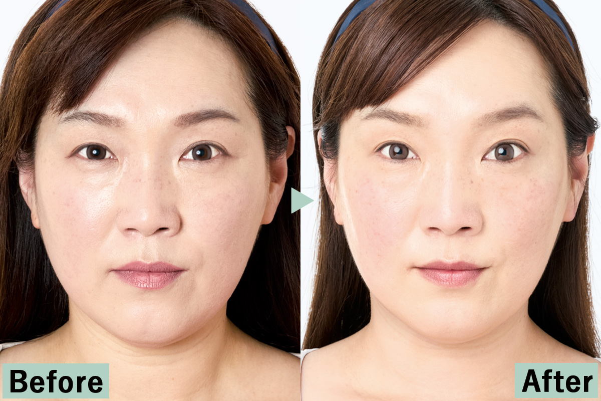 顎下のもたつきの変化や小顔感が良い結果に。ゆるんでいた表情もキリッとした印象に。効果は個人差がありますが約半年。メンテナンス治療としてビューティーエキスパートの間ではお馴染みの治療に。