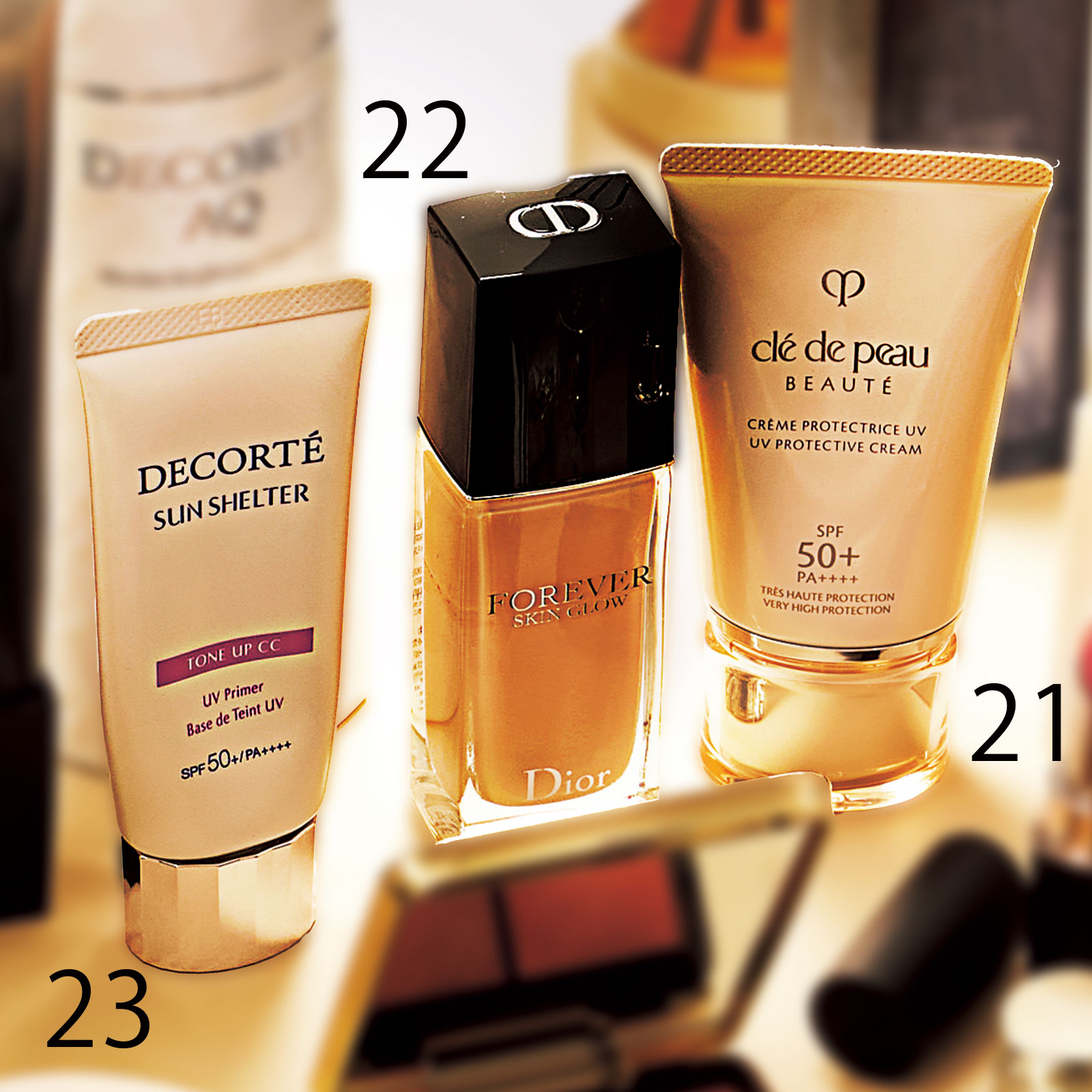 21どんな時でも持ち歩く、一番信頼しているUV。スキンケアしながら肌を紫外線から守るクレポ クレームUV n。22キチンと感が続く。ディオールスキン フォーエヴァー フルイド グロウ 1.5Nは明るく均一な肌色になり光であらも飛ばしてくれます。23紫外線をガードしながらトーンアップ。デコルテのサンシェルター マルチ プロテクション トーンアップCC 10はカバー力もあるからこれだけで外出可能。