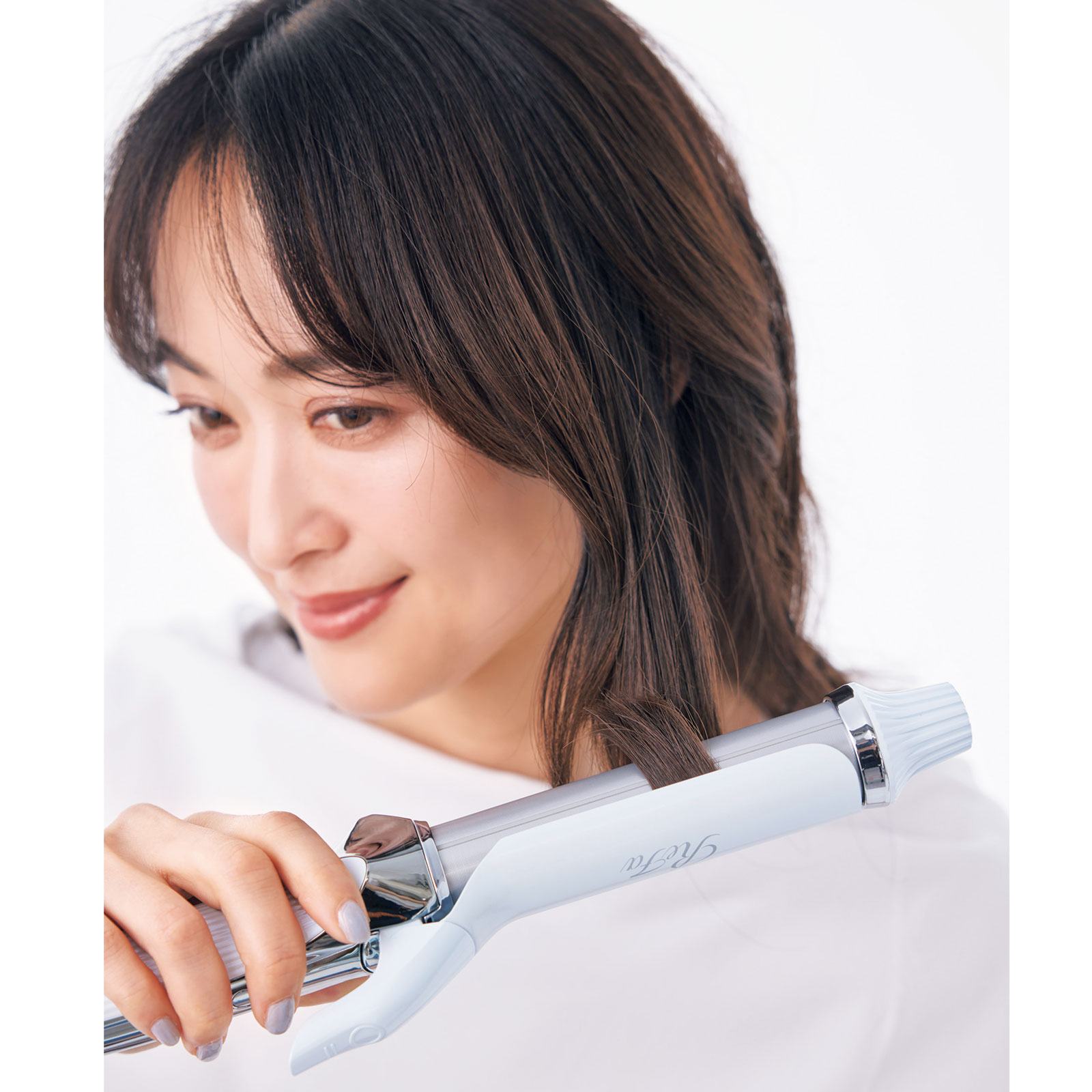 毛先を強めに巻くのも、全体を自然なミックス巻きにすることもできる、太めの32㎜のアイロンが使いやすい。リファカールアイロン プロ32 ホワイト¥25,000(MTG)