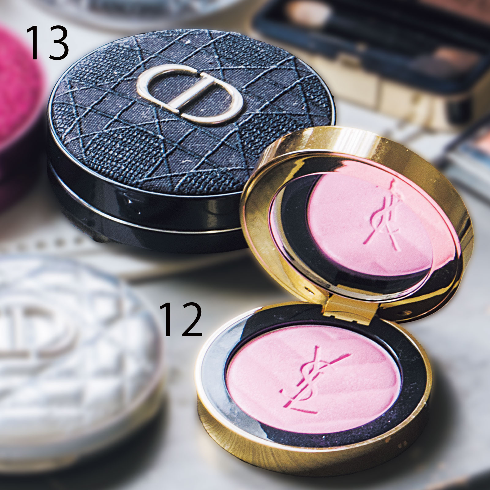 12ほのかな血色感ならこれ。自然に頬が染まるYSL メイクミーブラッシュ パウダー 42。13テク入らずでツヤ肌に。グロウ肌になるディオールスキン フォーエヴァー イドラ グロウ クッション00N。