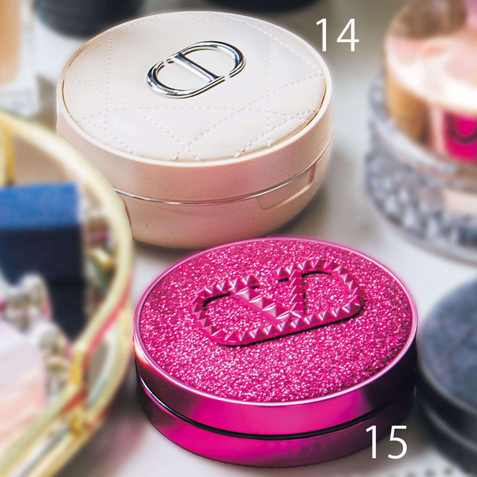 14圧巻の透明感が生まれます。ディオールスキン フォーエヴァー クッション パウダー ラベンダー。15美STの撮影がある日に。ツヤ感を爆上げするヴァレンティノ GO クッション グロウ PINK PP シークインLN2。