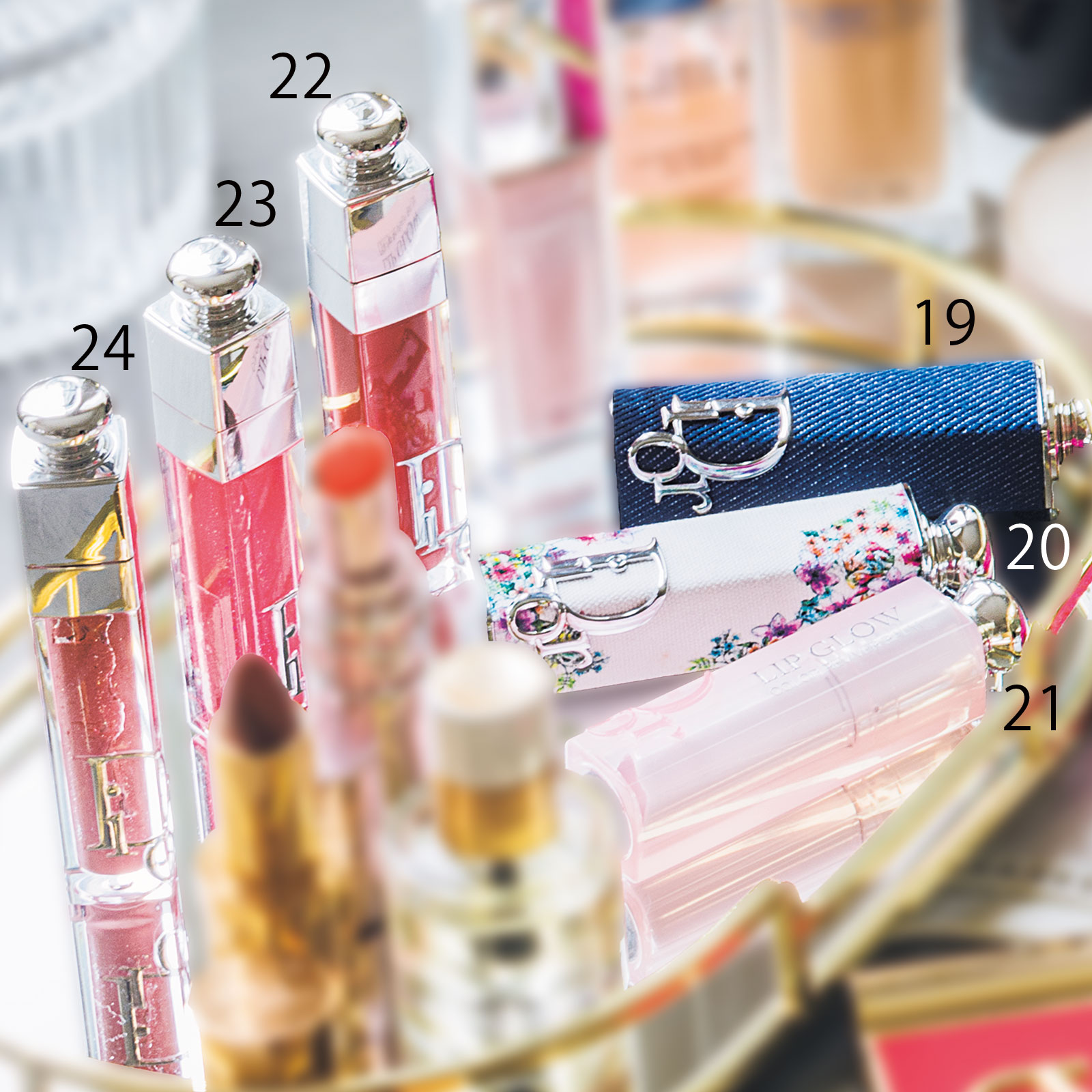 リップ命なのでプランパーはマスト。19、20 チュルンとした唇になるディオール アディクト リップスティック 100、526。21 リップ グロウ 007。22、23、24 マキシマイザー 005、026、029。