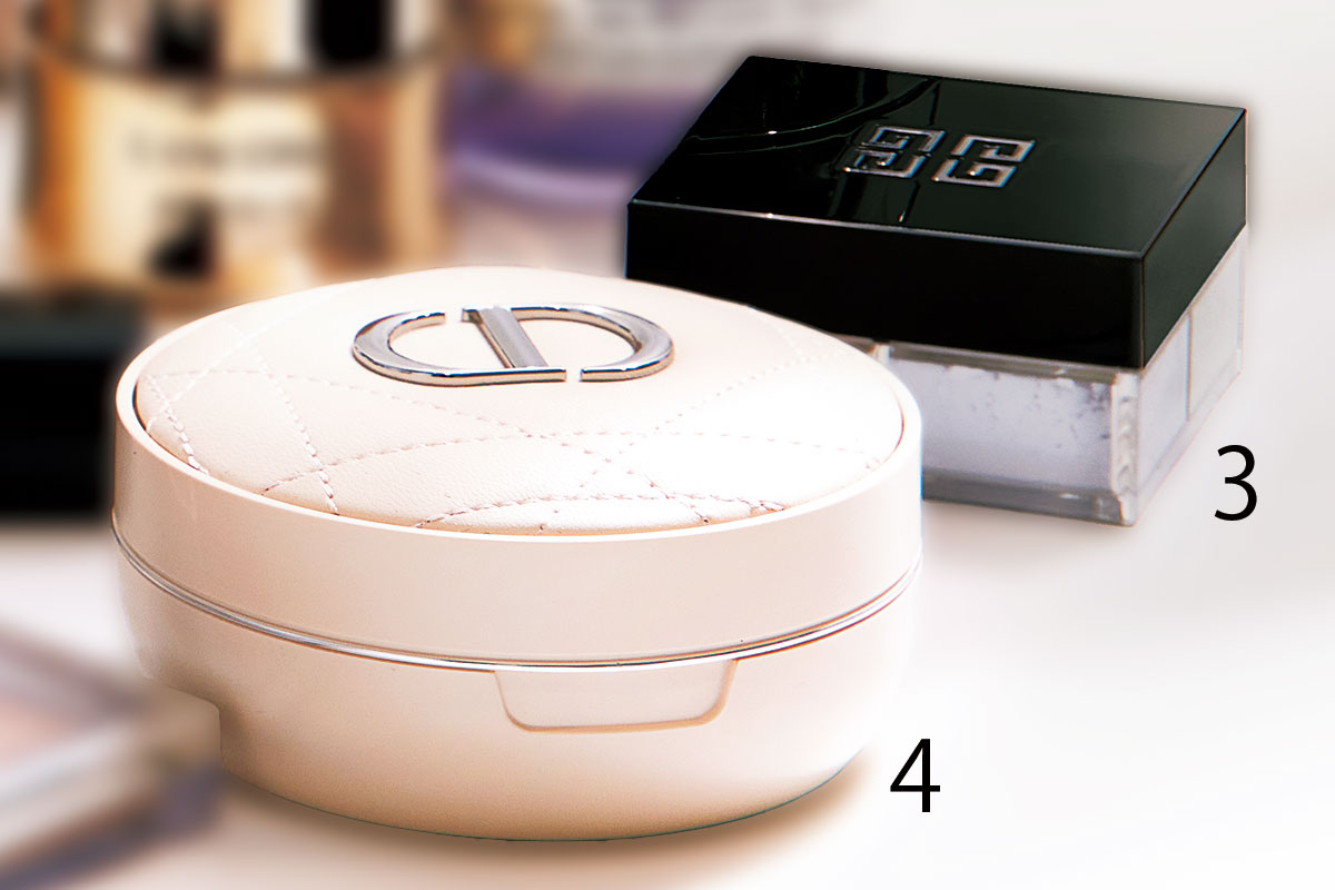 3自然な透明感を仕込むパウダー。ジバンシイのプリズム・リーブル 01はくすみをオフして透明感アップ。4毛穴も小ジワもなかったことにしてくれるラベンダーパウダー。粒子が細かくてピュア肌に仕上げてくれるディオールスキン フォーエヴァー クッション パウダー。