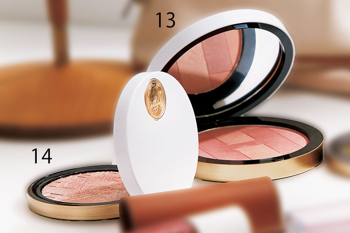 13元気に見せたい日にマスト! エルメスのチーク10番。3色のニュアンスピンクをのせるだけで顔色がパッと明るく。14毎日愛用しているメタリックフェイスパウダー。エルメスの限定パウダー02は、大人肌に上質なツヤを演出。