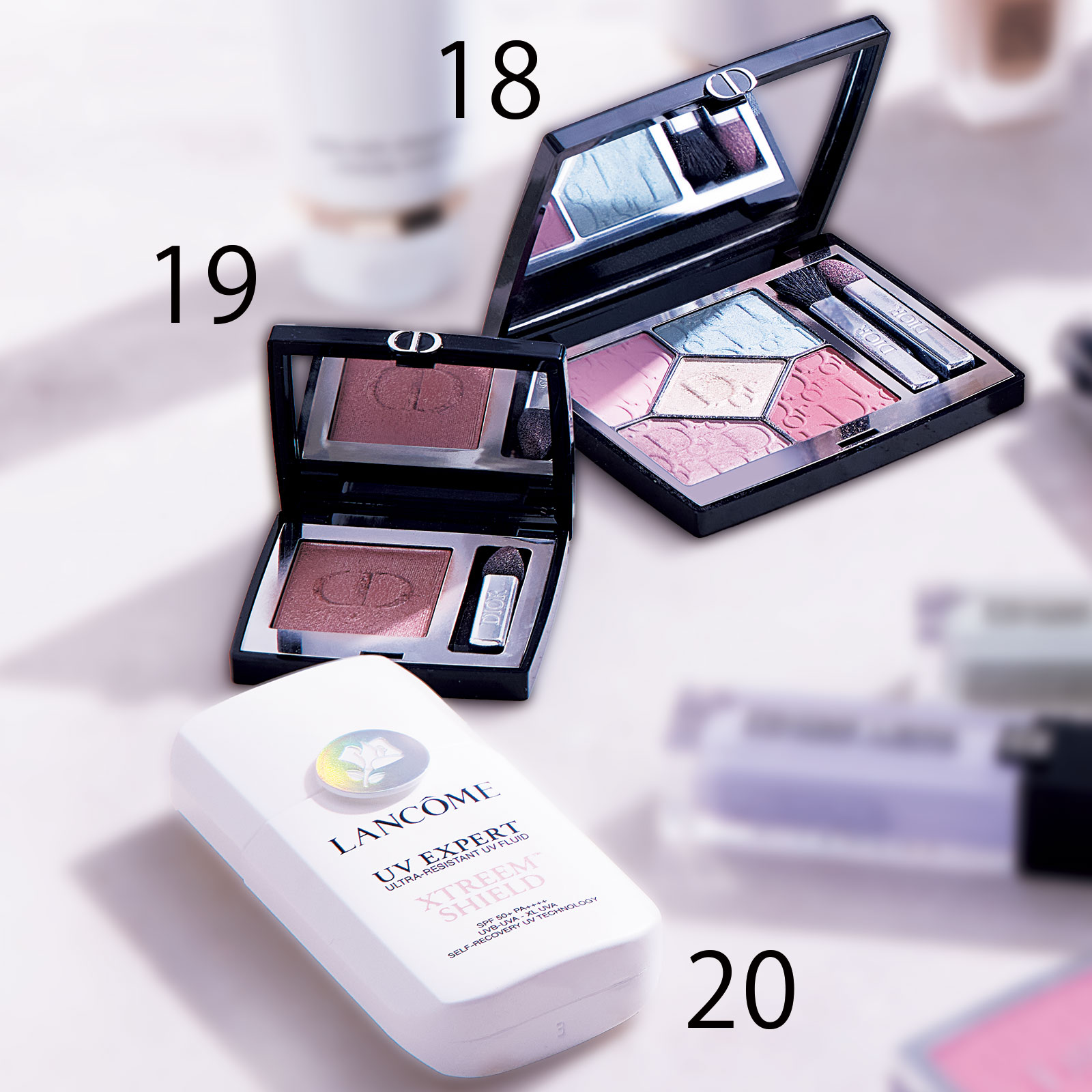 18おめかしの日のアイメイクに!ディオールの限定812はベビーピンク×ミントグリーンで可愛い目元。19赤みブラウンが大人の色気をプラス。ディオールのモノ クルール 755はオシャレブラウン。20軽い質感&ツヤのMyベストUV。ランコムの新作UVはSPF50なのに美容液のよう!