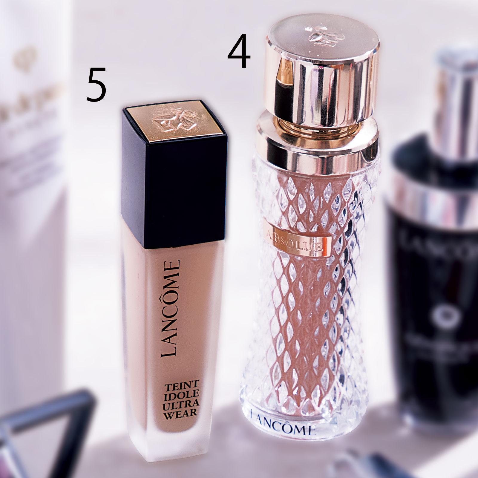 4美容液感覚のツヤファンデ。ランコムのアプソリュ ザ フルイドファンデーションはくすみや毛穴はカバーするのに薄づきで軽やか。5メイク直しができない日のマットファンデ。ランコムのタンイドルのリキッドはハイカバーで崩れにくい。