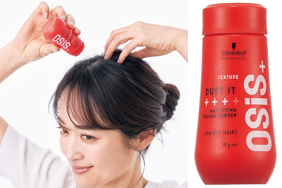 ペタンとしたトップにふりかけて、指先でクシュクシュともみ込みます。潰れた根元が立ち上がり、ボリューム復活。オージス ダストイット10g¥1,760(ヘンケル コンシューマーブランド)