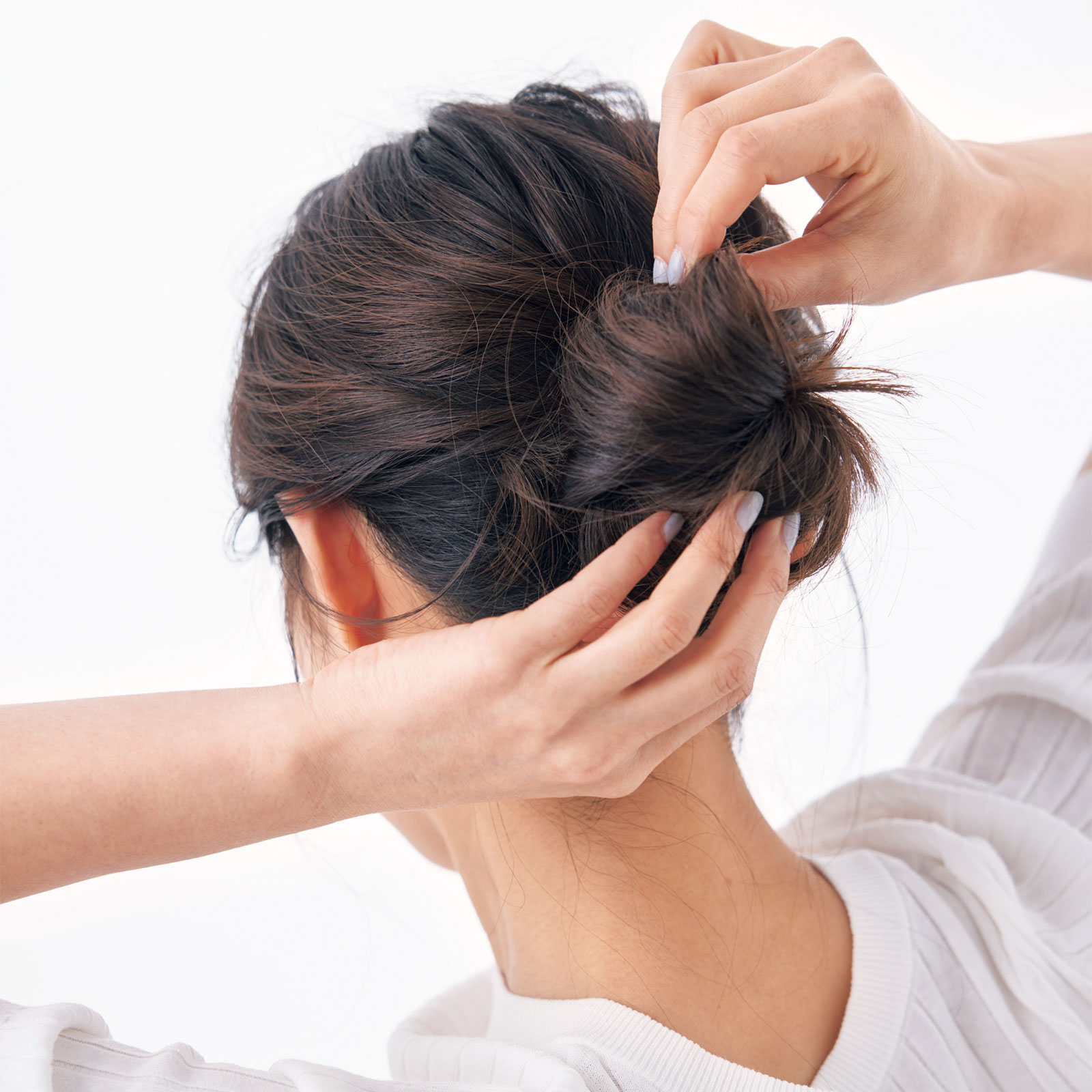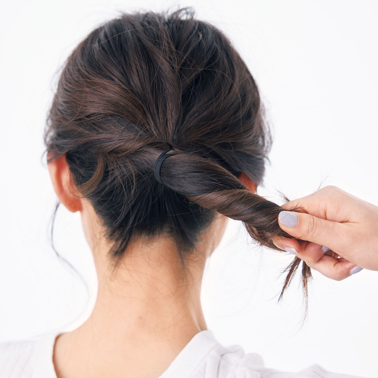 4.ねじった毛束を根元のゴムに巻きつけ、毛先をゴムにはさんで留めます。丸みのあるシニヨンが完成。