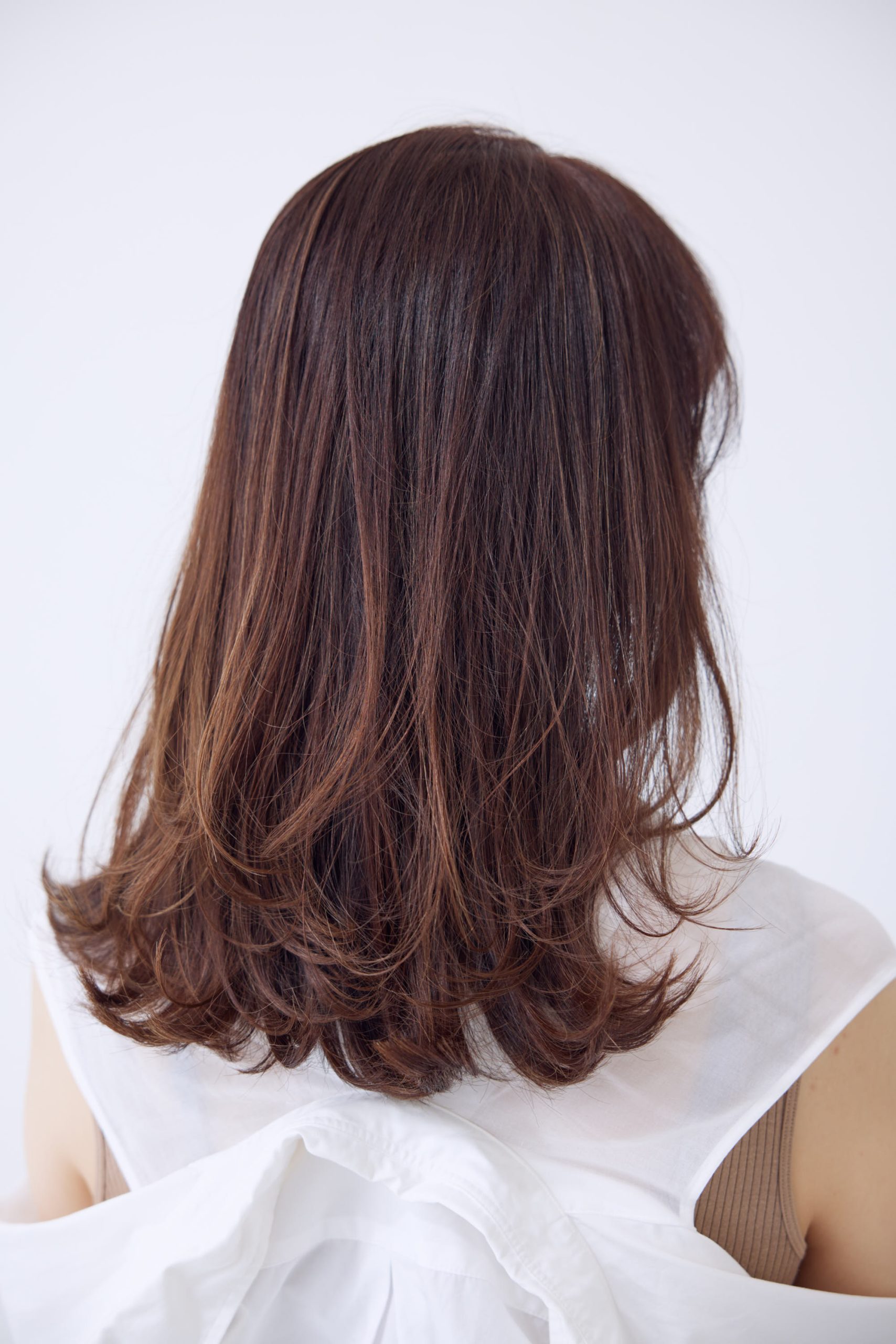 しっかりとくびれを効かせることで、メリハリのあるシルエットを演出。ペタンとしやすい大人髪でもボリュームをちゃんと感じさせ、かつトレンドの雰囲気もまとえます。顔まわりは目元に沿って流し、うれしい小顔見せも実現。