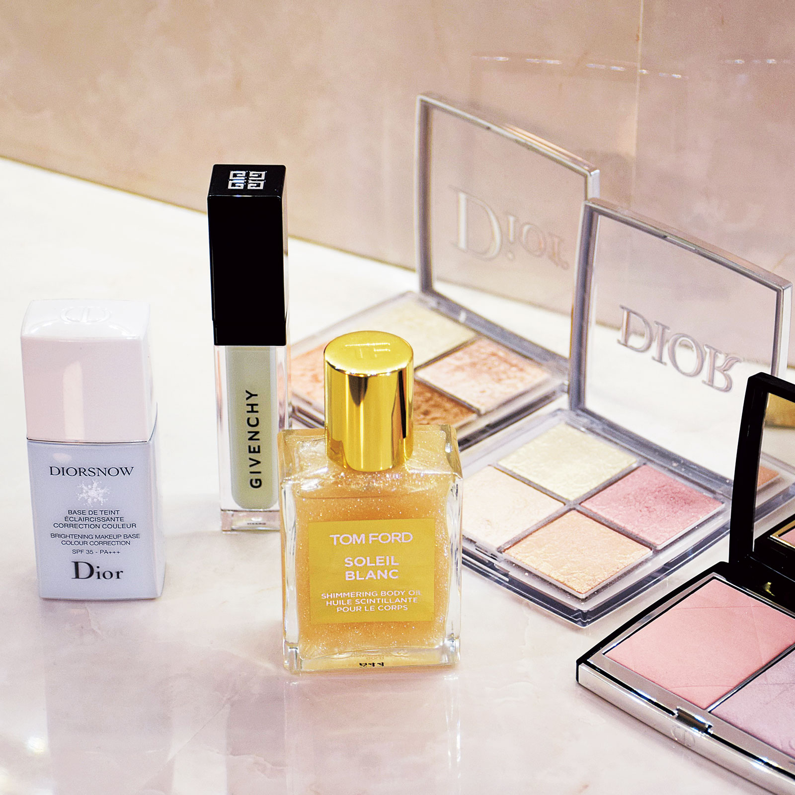 ツヤがありすぎると逆にアラが目立ってしまうので、肌馴染みがよく、肌にのせただけでヴェールのかかったようなツヤを出してくれるアイテムを選んでいます。ジバンシイのプリズム・リーブル・スキンケアリング・コレクターは赤みを消してくれるグリーンを、ディオール スノー メイクアップ ベースはくすみも飛ばしてくれます。ディオール バックステージ002、004、ルージュ ブラッシュ287は頬の一番高い部分にツヤ玉を作る時に。トム フォードのソレイユ ブラン ボディオイルはオフショルを着る日のデコルテに。