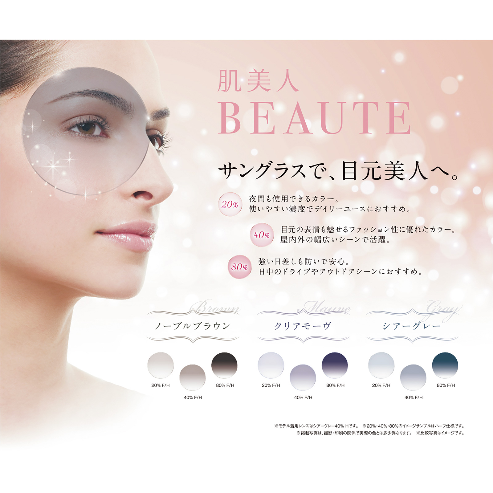 東海光学の“肌美人BEAUTE”はブルーライトカットの黄ばみを抑えながらも肌の透明感を引き出してくれるレンズカラーがずらり。
