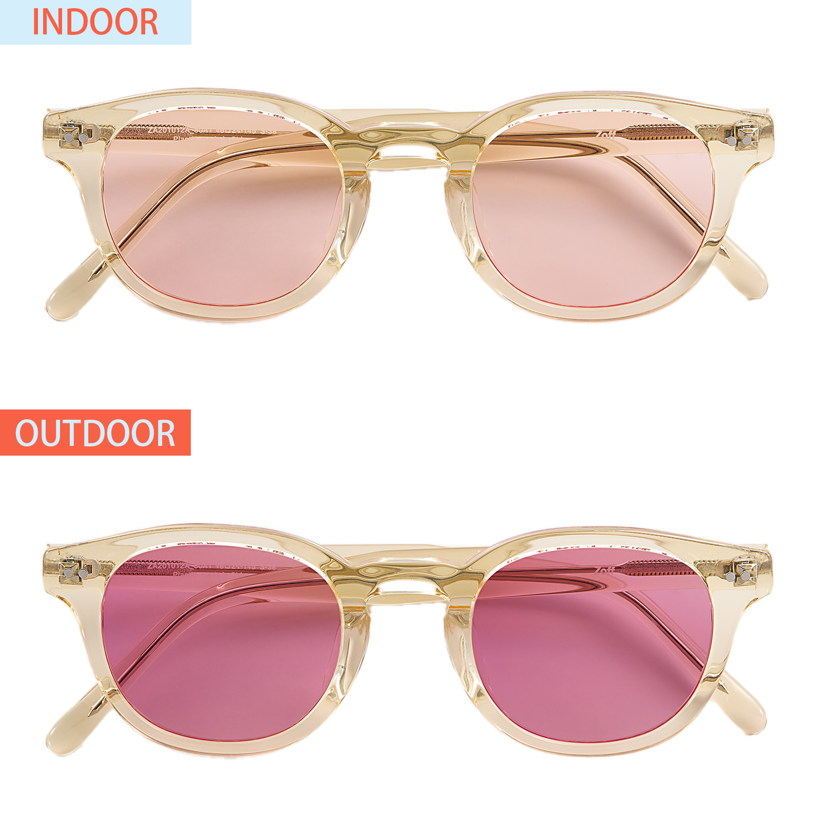 クリアフレームは旬っぽさを発揮。「SA Color Sensor」UV420カット調光レンズ(パープル)¥15,400クリアフレーム¥51,700[ギャレット ライト カリフォルニア オプティカル](ともにブリンク ベース)