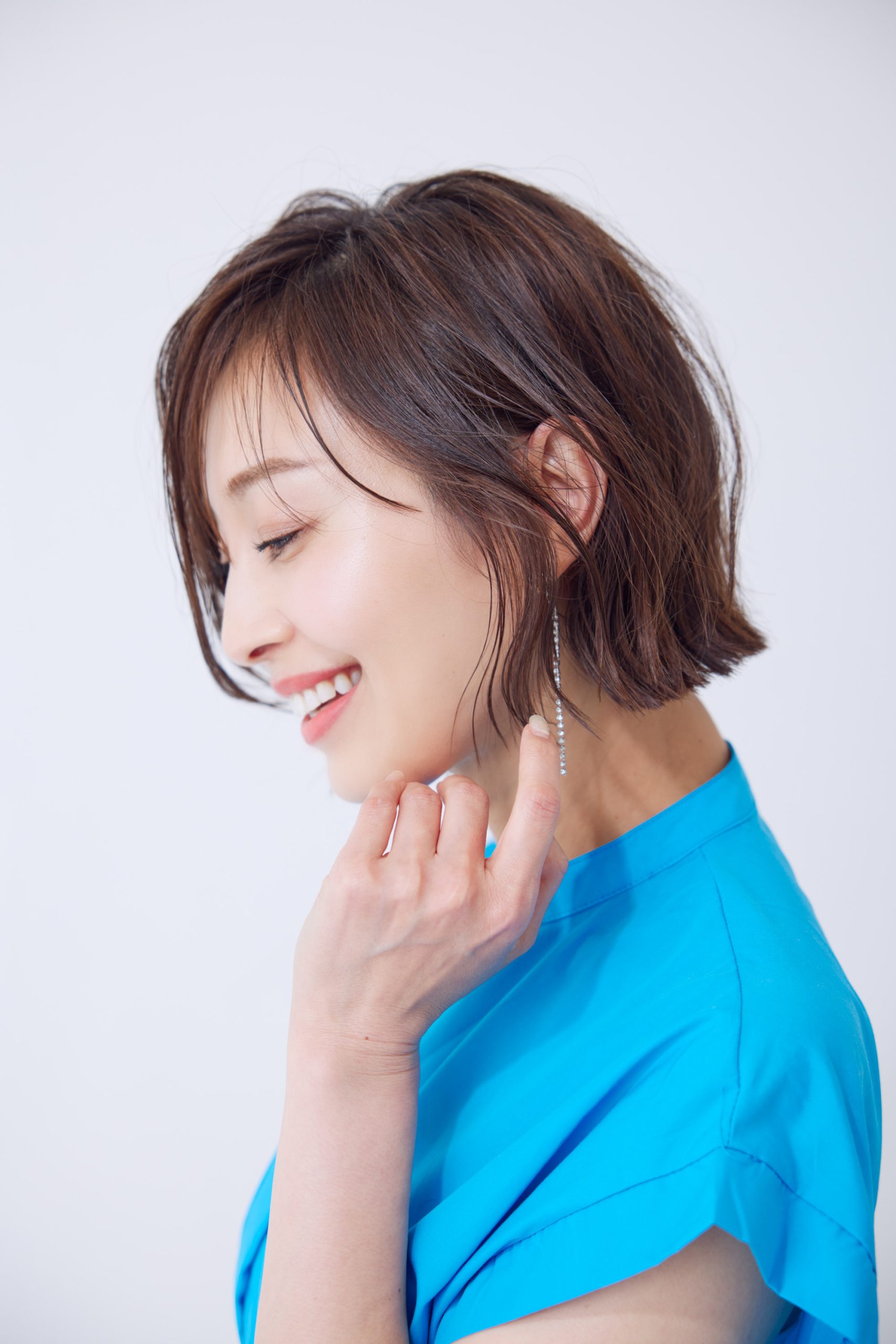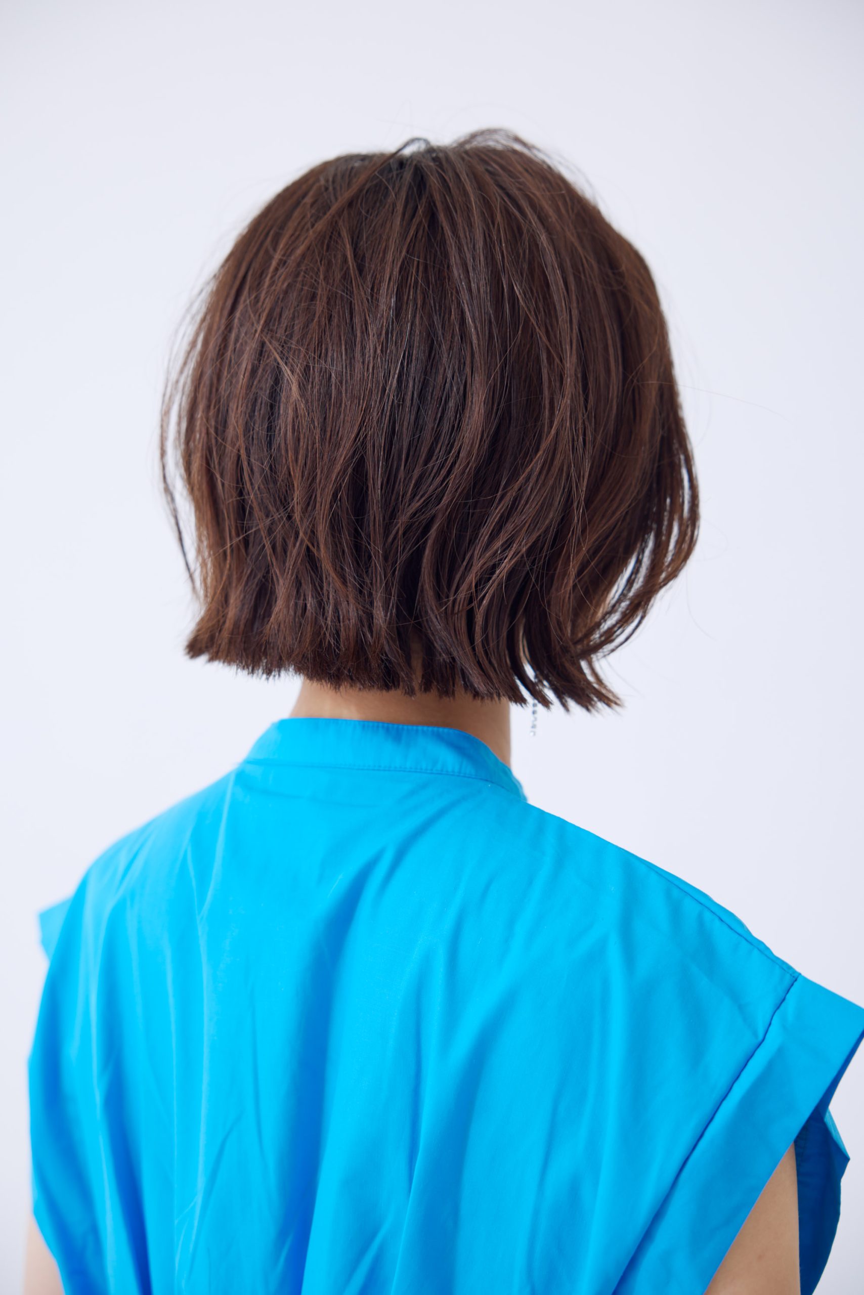 ボブの襟足の長さはアゴラインに設定。頭の形をきれいにコンパクトに見せ、首元をすっきりと、さらに小顔の効果もある万能レングスです。耳かけして少し崩すのが気分。
