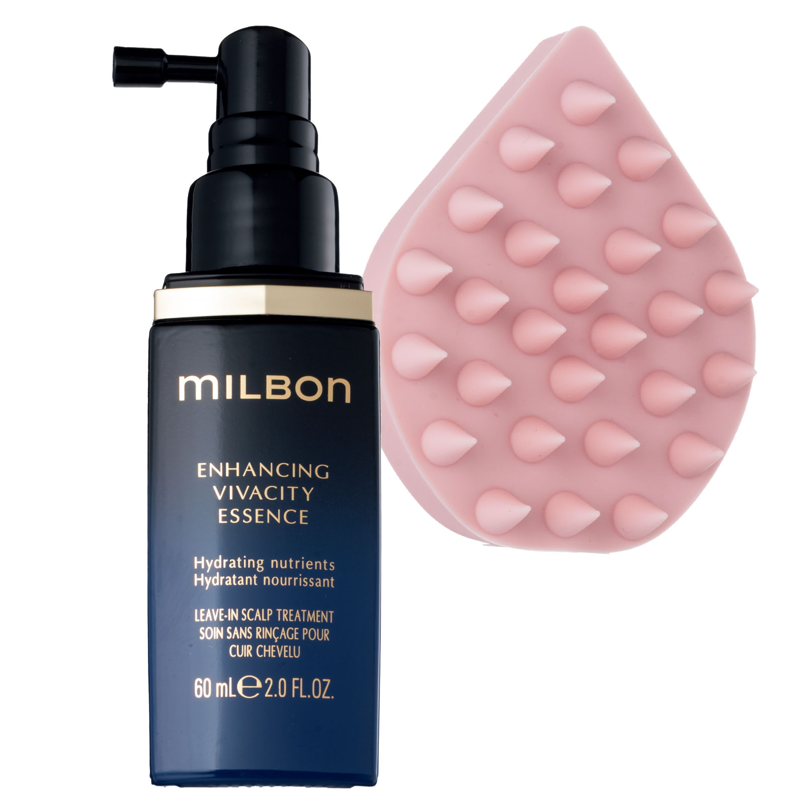 (左から)5つの有効成分であらゆる脱毛要因にアプローチ。ミルボン エンハンシング ビバシティエッセンス[医薬部外品]60ml ¥6,600(ミルボン、美容室専売品)頭皮のツボを刺激しコリをほぐす。リラクシングマッサージブラシ マットピンク¥1,925(エトヴォス)