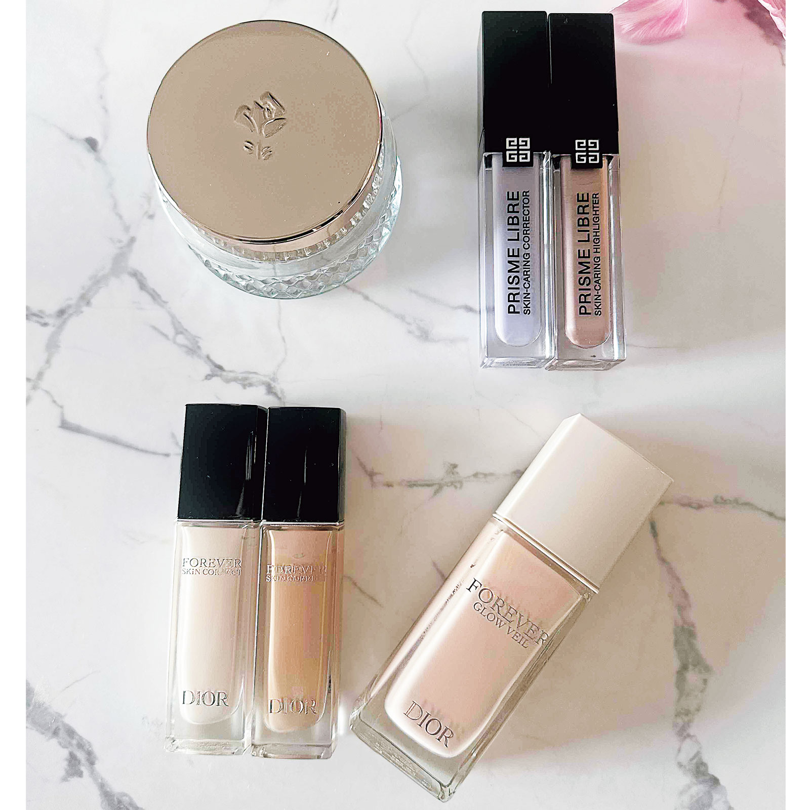 ジバンシイプリズム・リーブル・スキンケアリング・コレクターのラベンダーはファンデーションの直前に仕込んでツヤ肌に。ディオールスキン フォーエヴァー グロウ ヴェールの上にスキン フォーエヴァー スキン コレクト コンシーラー 0.5Nを赤みやクマに、00は凹凸を出したい部分にオン。ランコムのエッセンス イン パウダー 01でテカリを軽減。